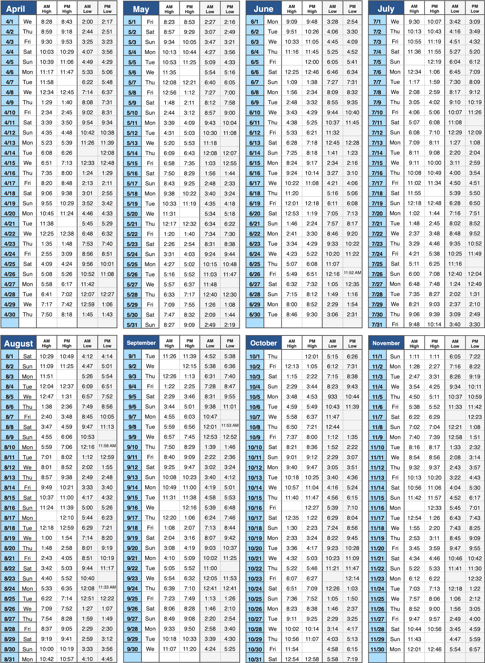 All times are for OC Inlet. Add approximately 1 hour for Sinepuxent Bay (Behind Assateague) and Isle of Wight Bay (Route 50 Bridge.)