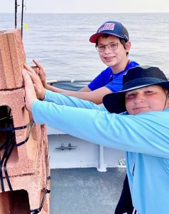 Young misters Jack K of Harrisburg & Kaleb E from the great state of Michigan (and here I have to add what a great state Michigan is or risk the wrath of my many Cousins) ..both young men gave today’s reef blocks a hearty shove while atop Capt. Bob Gowar’s Memorial Reef before heading further out.