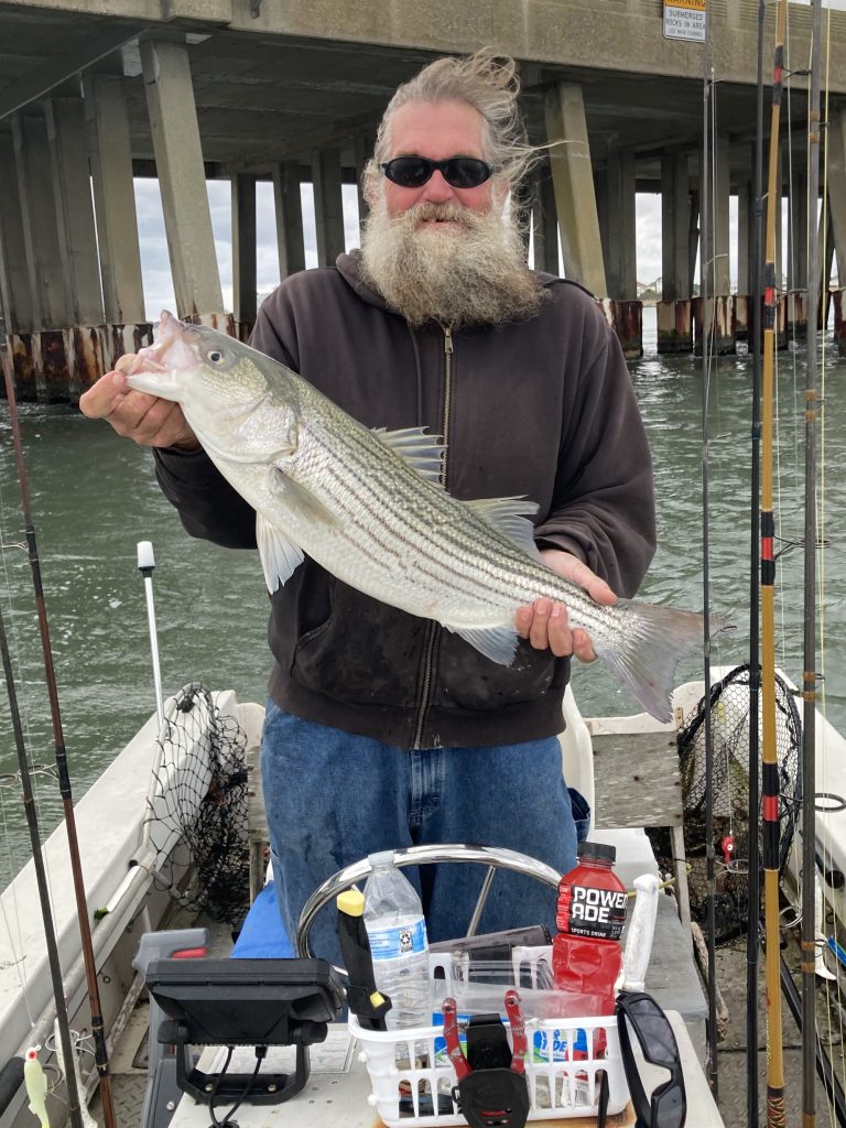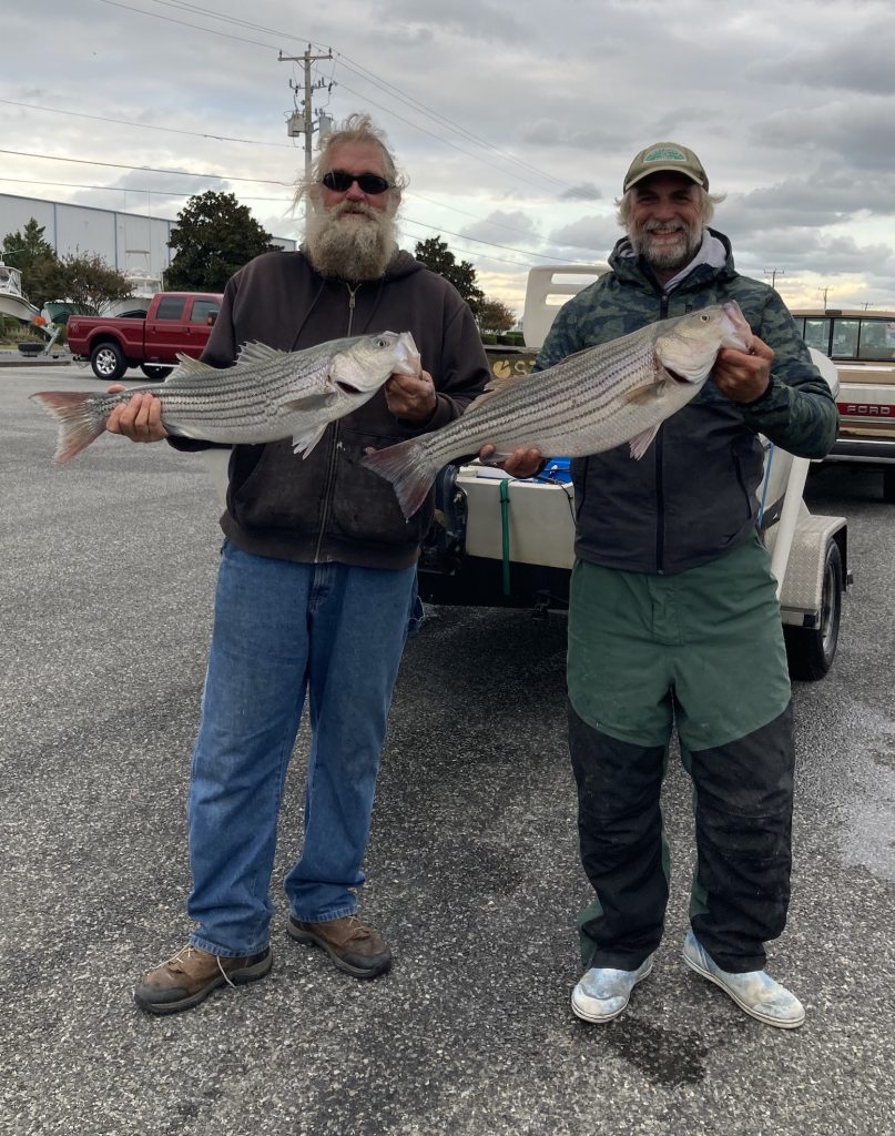 It was a rough, windy, chilly day today, but according to Big Bird Cropper the rockfish were hitting good. Big Bird and Shaun Flaherty were out in today’s blustery conditions and had a very good day dredging Stretch lures and casting Roy Rigs at the route 50 bridge. You can tell by Bird’s flowing locks that the wind was cranking, but so were the guys….on some very nice rockfish that included two keeper fish.