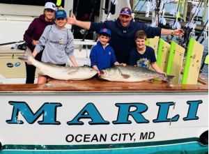 It’s trophy rockfish season over on the Chesapeake Bay and Fish in OC charter partner Marli with Captain Mark Hoos and mate Mark Stephens are over fishing out of Solomon’s Island. Yesterday the Martin family caught a couple of BIG rock when they landed these fish of 50″ and 51″.