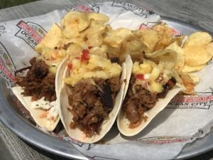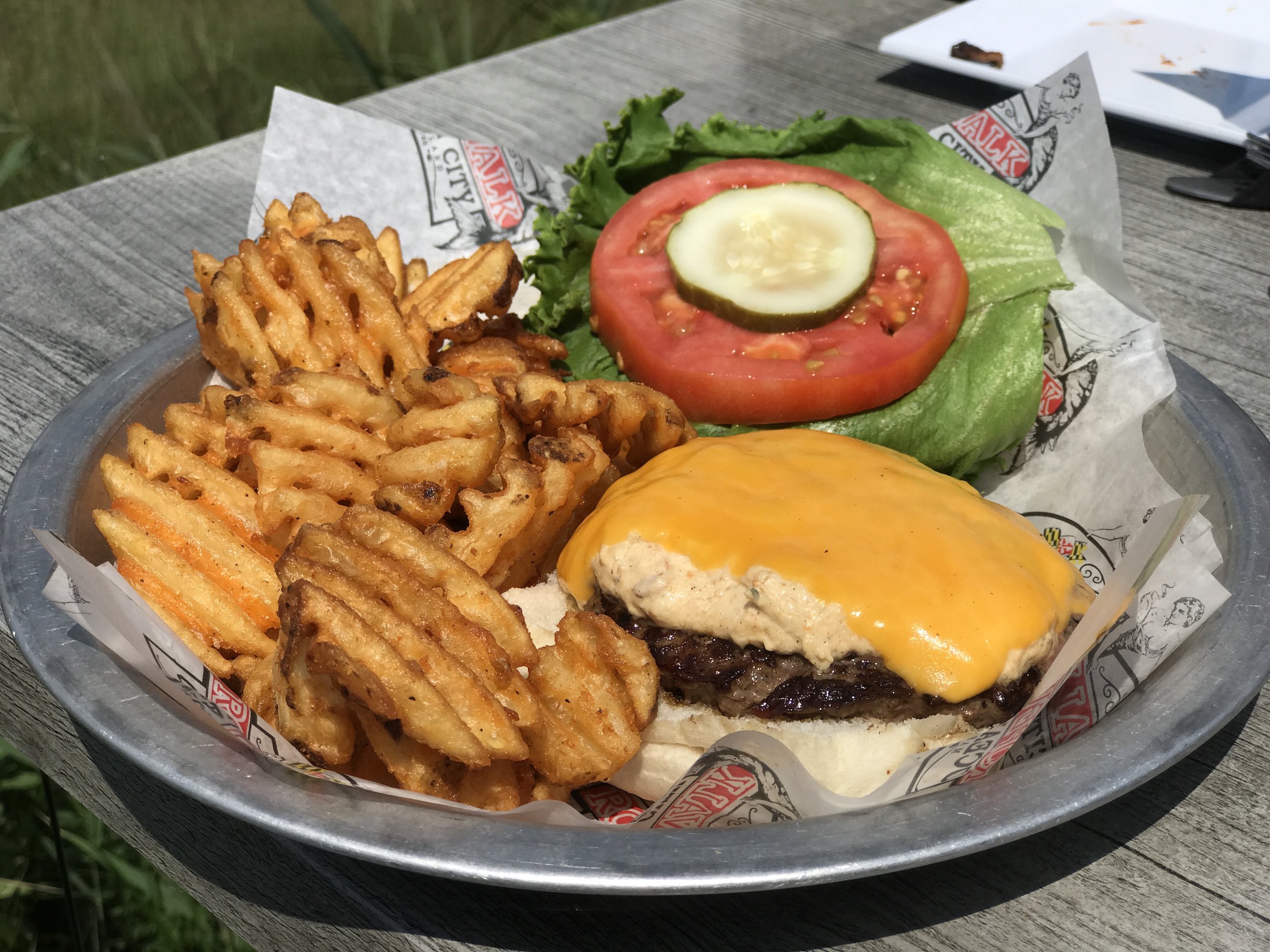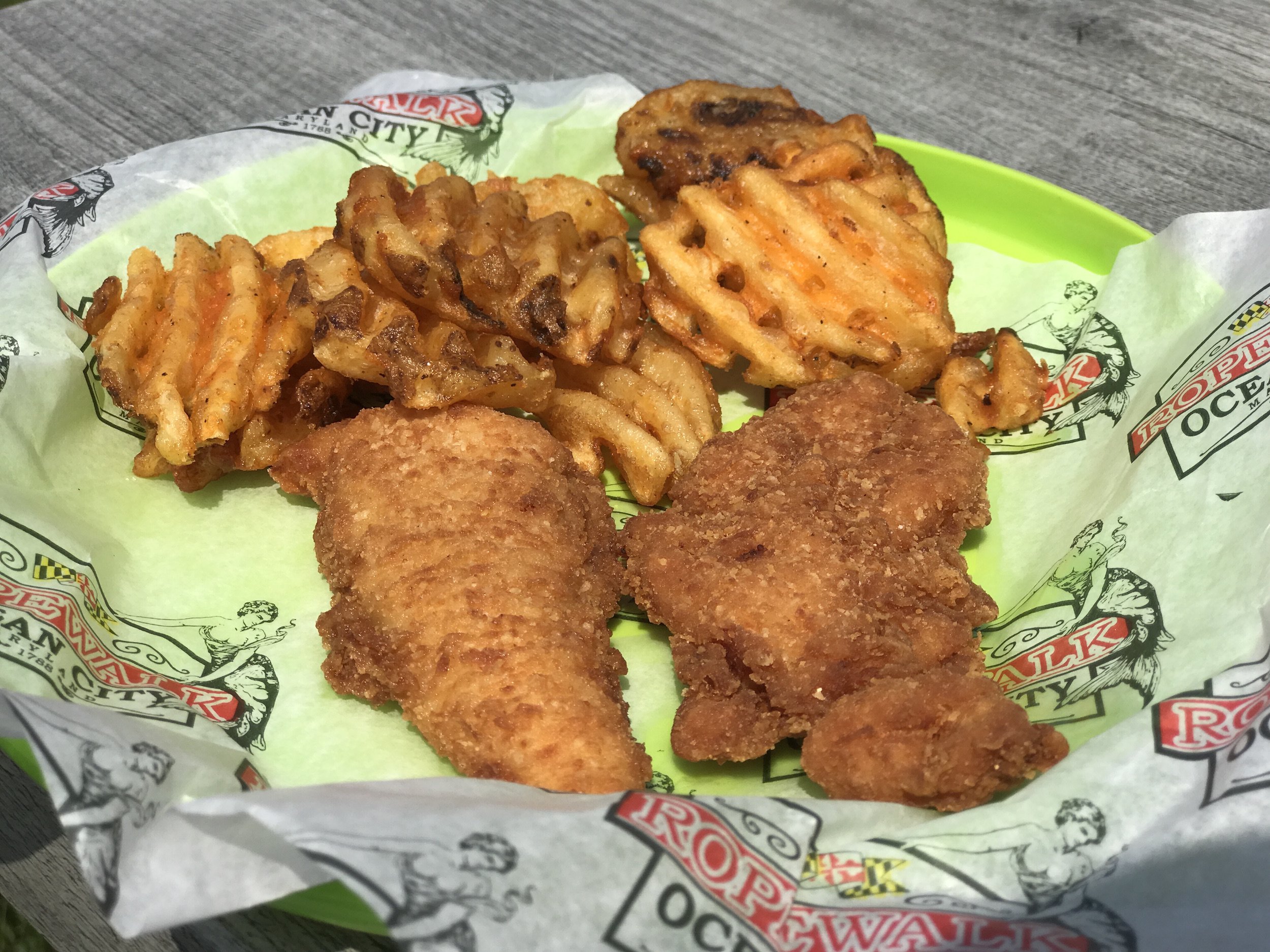 Up next, we ordered Pulled Pork Tacos with Frips, the Delmarva Burger with Waffle Fries & Chicken Tenders with Waffle Fries off the kid’s menu. The pulled pork tacos were a delicious combination of house smoked shredded pork layered with coleslaw & pineapple salsa on a soft tortilla. Scott said, “It was really good with a perfect combo of flavors & the right amount of food so it didn’t fall apart when I bit into it.” They are served with crispy, hot frips which are basically a version of hot potato chips if you’ve never had them.