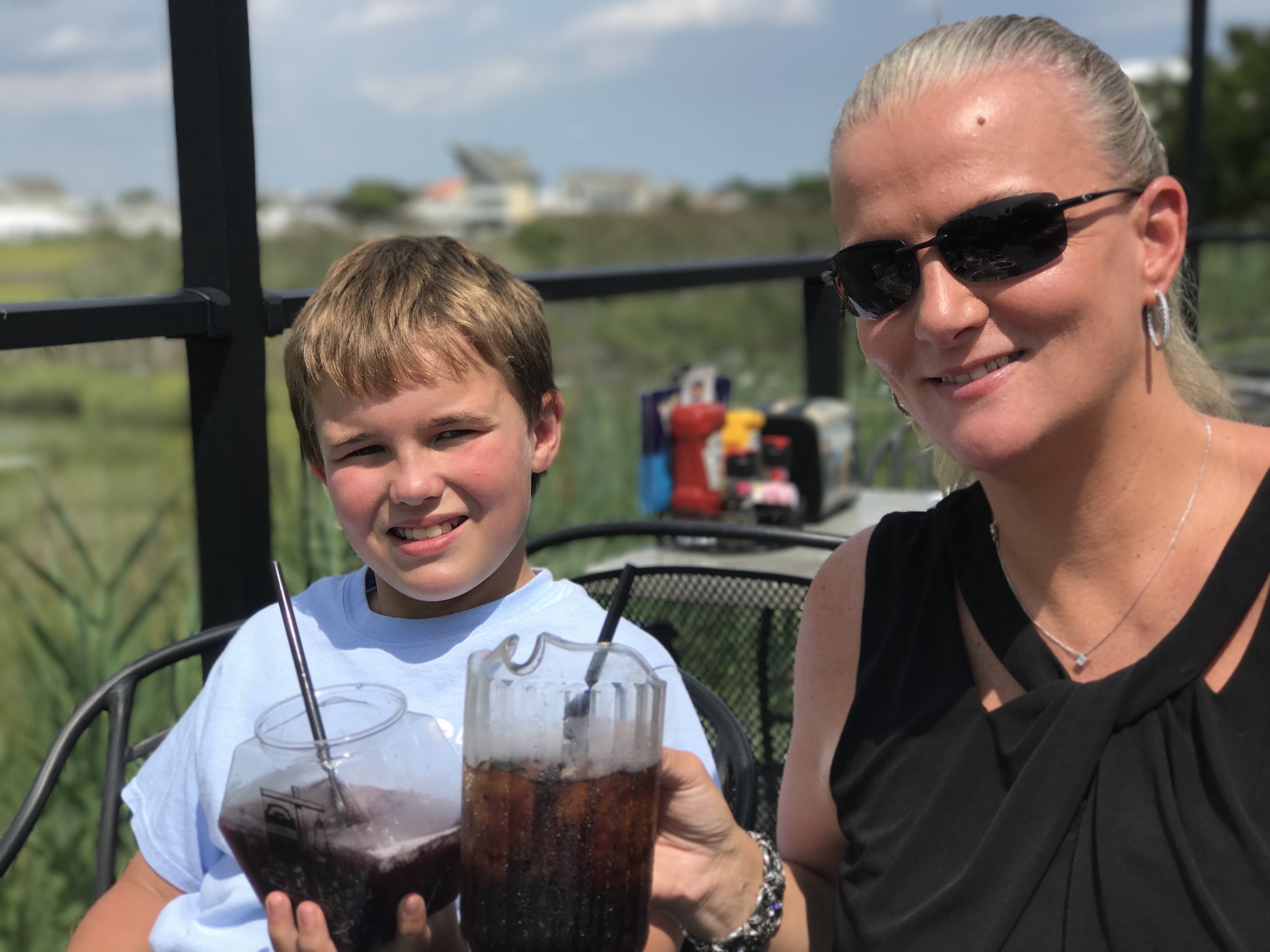 Scott, Ryan & I were seated on the deck & our awesome server Shannon came right over to get our drink orders. If you’ve never been to Ropewalk OC before then you may not know they serve your soda in a small pitcher. Also, they have kid’s Fishbowl Slurpies for $5.00 complete with Swedish Fish. The server will “feed the fish” with Poprocks… a cute touch to make the kids smile. By the way, Ryan said the grape slushy was amazing.