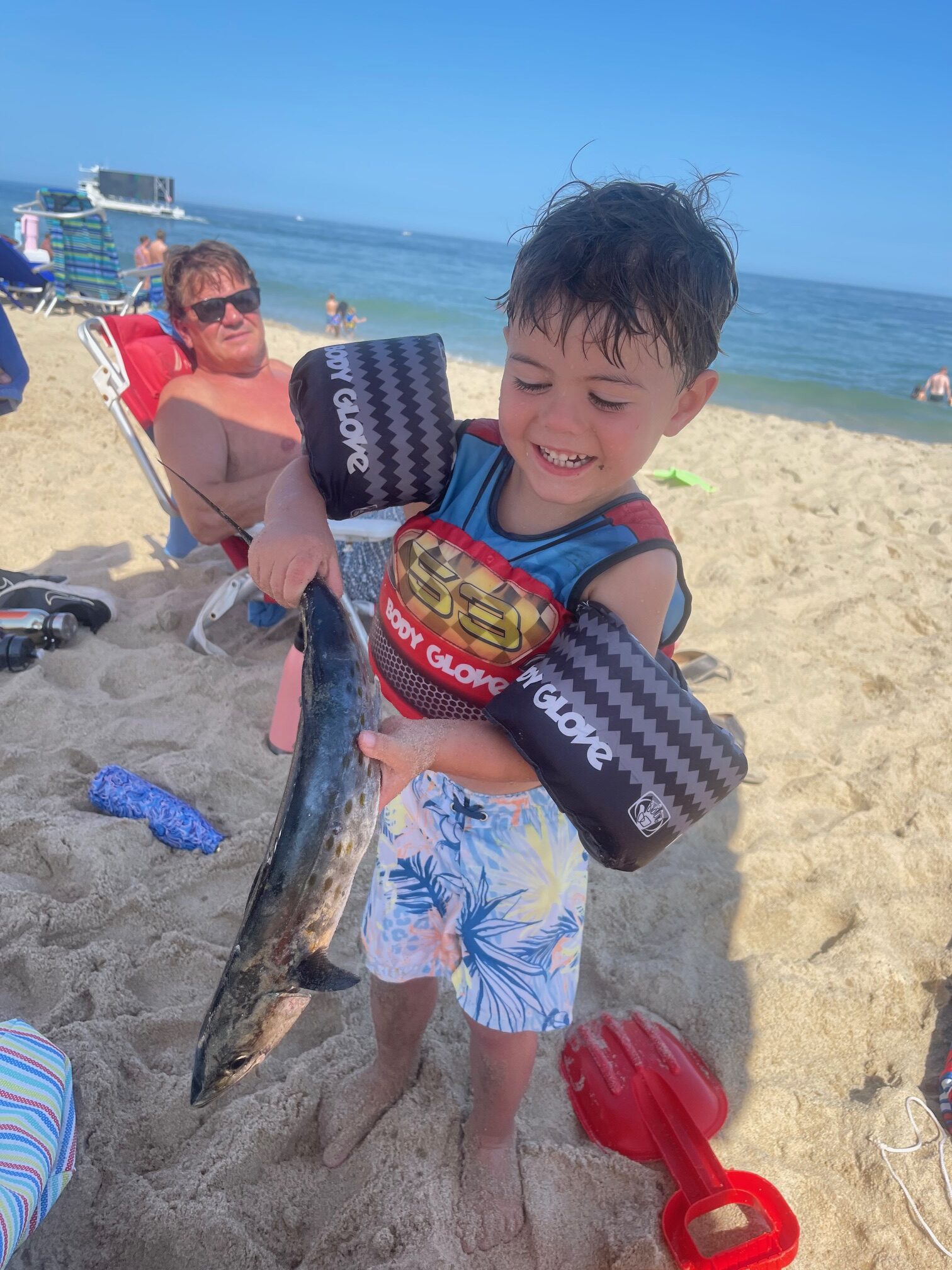 three year old Peyton Corey got this Spanish mackerel after an osprey dropped it on the beach Right in front of him.