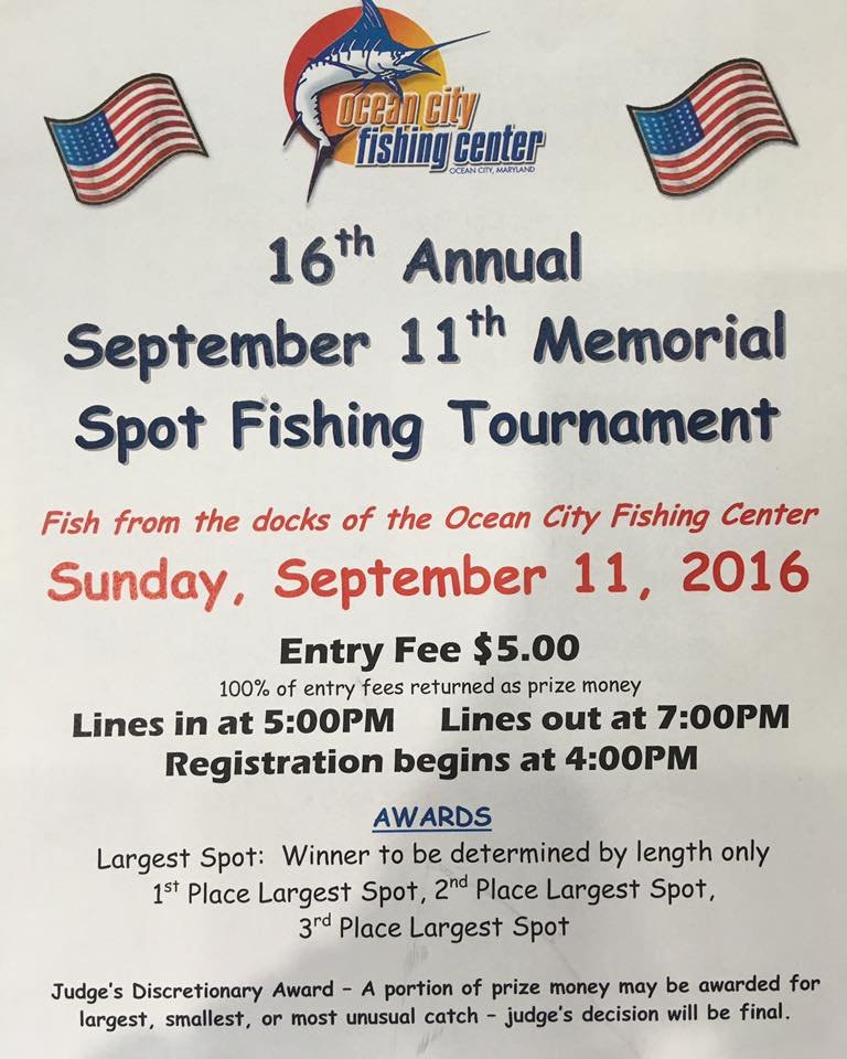 Tomorrow is the Ocean City Fishing Center’s September 11th Memorial Spot Tournament. This is a terrific event that is a lot of fun for adults and kids. The captain’s meeting is tomorrow afternoon at 4 PM and fishing is from 5 PM to 7 PM right from the docks at the Ocean City Fishing Center. I’ll see you there!