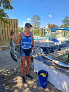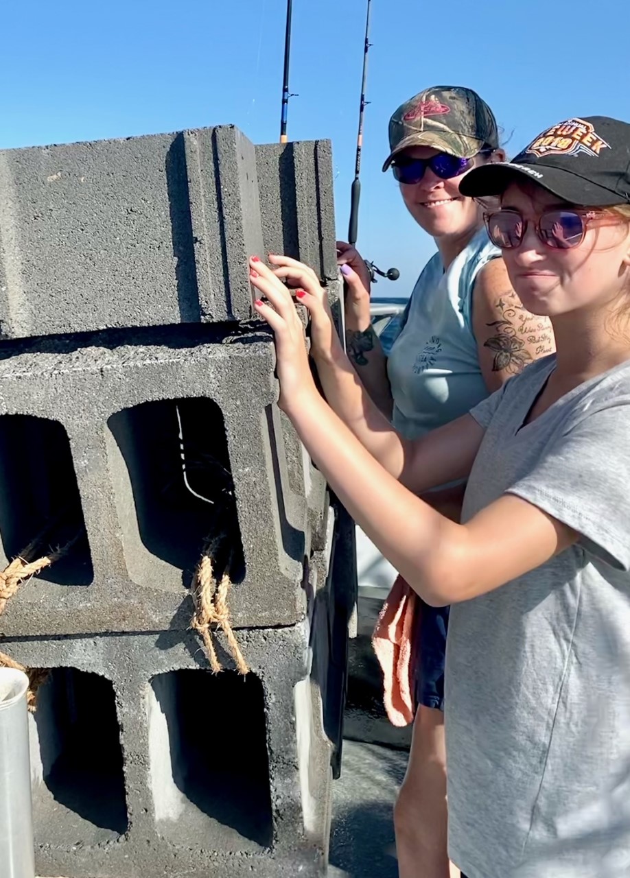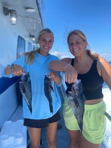 A regular trip this day, it began with an almost fall coolness & a crisp, clear sky. Sun was up time we’d cleared the inlet; no glorious morning pictures. We eased on off a good ways before Rebecca & Kimberly sent today’s block unit by the stern rail. We soon began fishing.