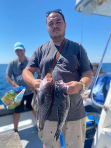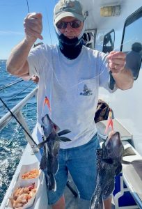 On my last stop, for instance, clients dropped into a tall stand of sea bass which followed the baits down. One fellow caught an awesome double—hardly anyone else got bit!
