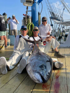 It’s been tough to get a tuna to the boat after hook up over the past several weeks thanks to the sharks out in the canyons, but today the crew of the private boat Gypsy Danger got it done. Captain Lolo Gensler, Brian, James and Rober Smack, Ben Harding and Alex Kasathsko landed this beauty of a 200 pound bigeye and hung it up at the Ocean City Fishing Center.
