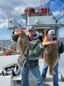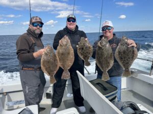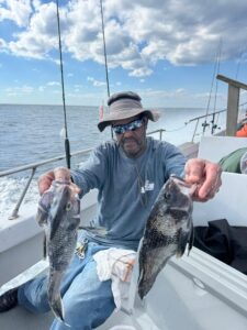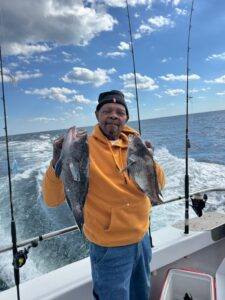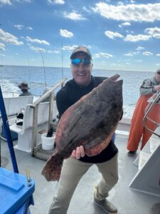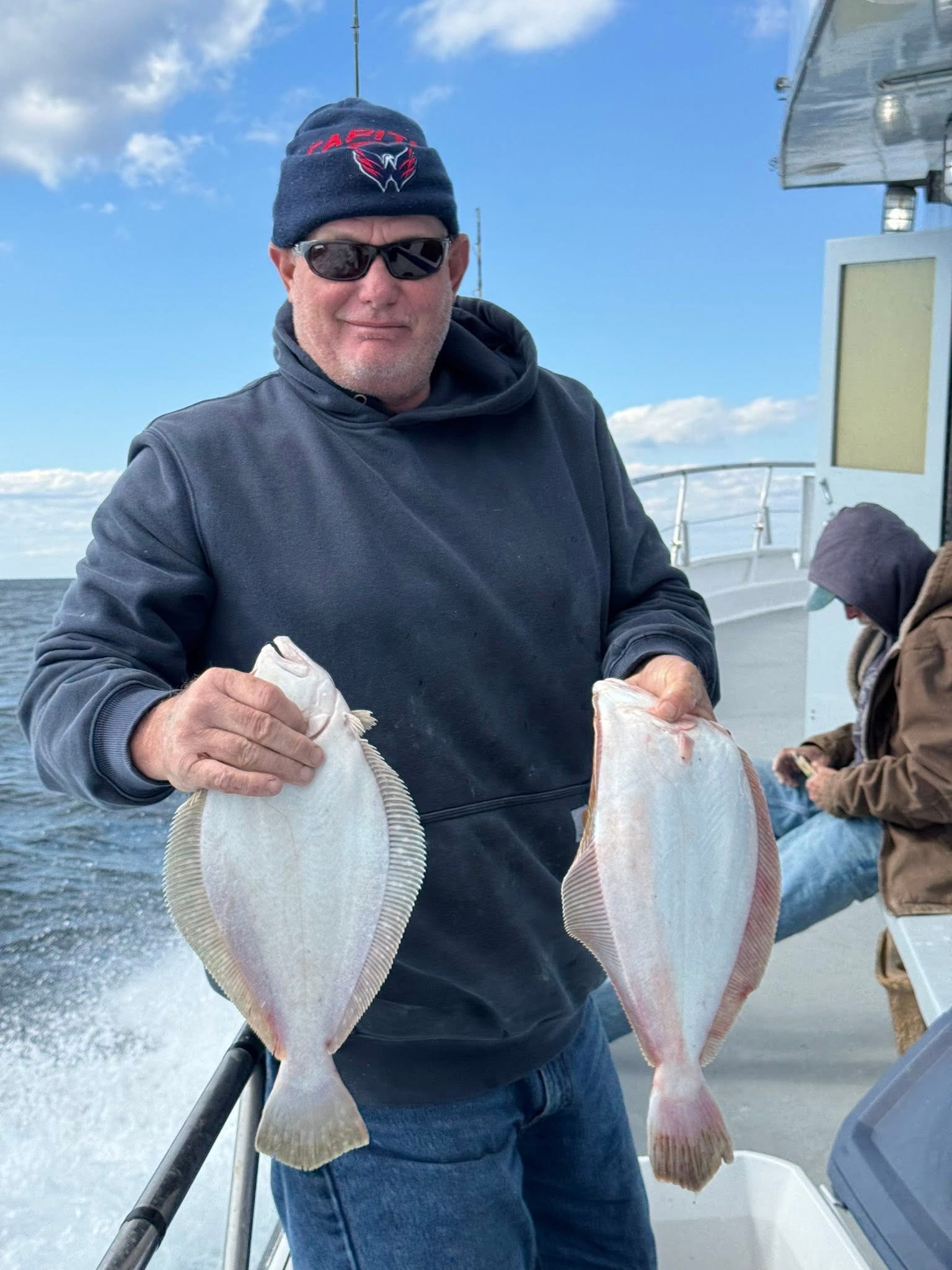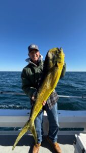 I had the opportunity to head out on the Angler today with Captain Chris Mizurak and mate Steve for their first trip back after a long summer of “technical difficulties” and it was an awesome day to be back. I personally had 13 keeper sea bass and three keeper flounder up to 20″ and there were lots of other fish around the rail. My buddy Mike Dzurnak caught his personal best flounder of 24″ and almost 6 pounds, but even that was no match for the fish pool winner. Johnny was lucky enough to catch one of a couple of rogue mahi that randomly swam by the boat early afternoon and was skillful enough to get the fish to the net. It was a very nice mahi at just under 16 pounds and it took the fish pool easily. This should make for a great new episode of Hooked on OC next month.
