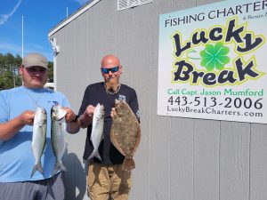 Some snapper bluefish showed up in the back bay today and Captain Jason Mumford of Lucky Break Charters put these guys on a couple along with a keeper flounder.