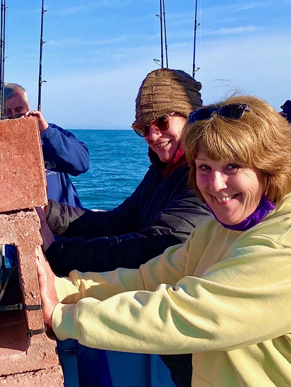Tristan from Lewes & Greta Spangler of Lebanon PA were our guest reef builders today; they pushed twenty blocks off the ramp & by the rail — offshore further we went.