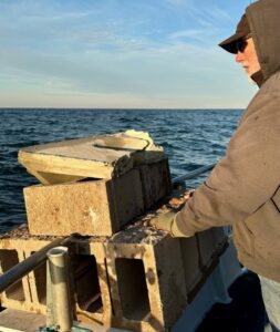 Weather looked OK; seemed like it would play-out alright. Could have even called it decent in the morning. John deployed 20 blocks and a special pyramid for Ms Nancy before heading on off further. Day started with a pass. My first stop didn’t look worthwhile – left it for another day; another year more likely. Second, third, fourth & fifth spots all looked fantastic. Indeed, I’m certain the fifth had enough cbass to seal the deal – limit us out. As luck would have it this day, however, all those spots also had the dreaded green eyed spiny dogfish – a shark of ill repute if ever there was! Couple drops cbass – then swiftly our catch would become all sharks. Oyyyyyy… Borrowed from US Artillery “Shoot & Scoot.”Shifting winds made the day doable. More west; then more south, then back – at 17 to 19 knots it could have built a set has it locked on the compass. Wind came hard south just as the boys hauled anchor for the last time.Came a light rain.. Dreary day – dreary catch (for this time of year!) Just two fellows limited. A few did very poorly. Wasn’t for a lack of trying. Everyone gave it their best. My crew had to pull anchor 11 times. I looked an additional 3 spots that didn’t appear worth anchoring over. Tomorrow looks calmer by far ..but still cloudy with a light shot of precip late in the afternoon. We’ll make it work. Will try to evade devil dogs.. Cheers,Monty(Seeing cbass cannibal behavior – seems more than ever for fall. 3 to 5.5 inch sea bass being snacked on by 14+ in)
