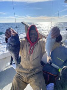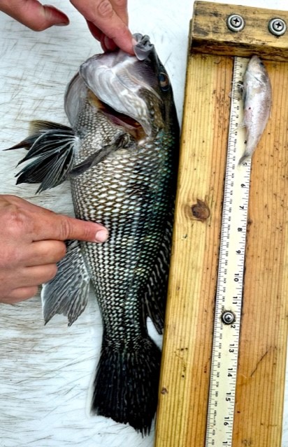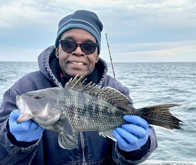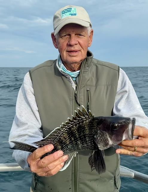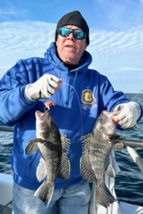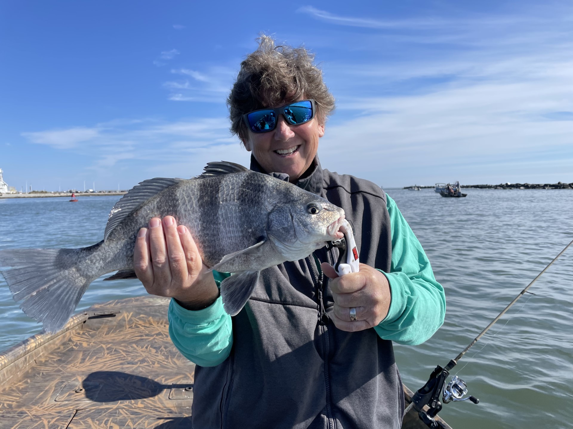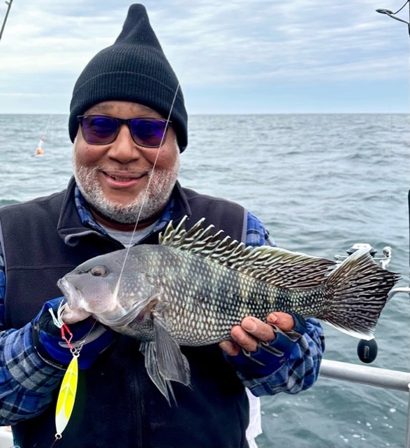 Becky Vail was using a tog jig with green crab inside the south jetty on board her “Bay Life” when she landed this pretty black drum.