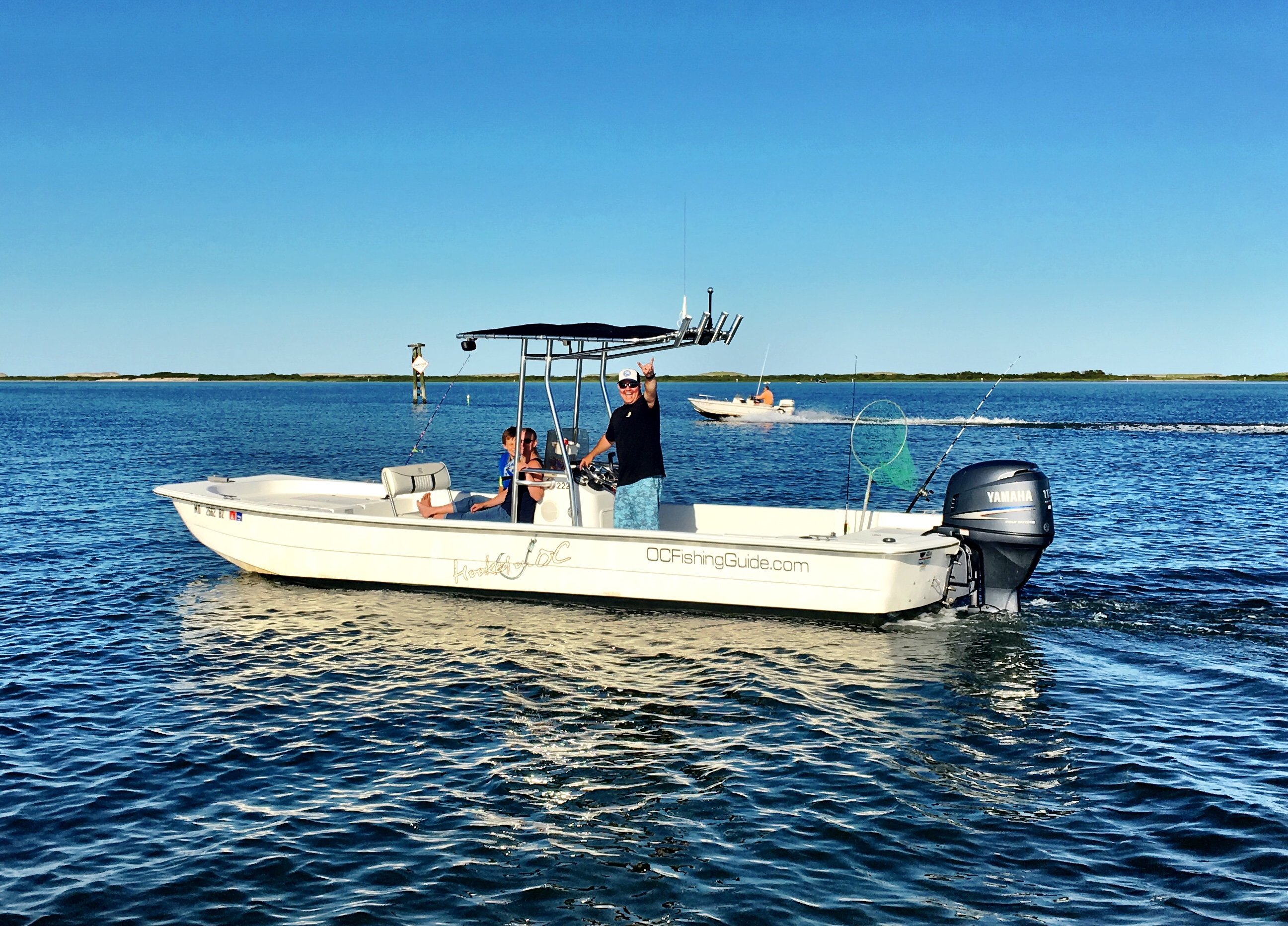 I had an opportunity to fish myself this afternoon and although I didn’t have any luck, I was able to watch Captain John Prather on the Ocean City Guide Service catch a couple of keepers behind Assategue Island. Captain John put these anglers on keepers using Gulp 4″ swimming mullet….and got a great shot of the Fish in OC / Hooked on OC skiff out for a nice evening on the water.