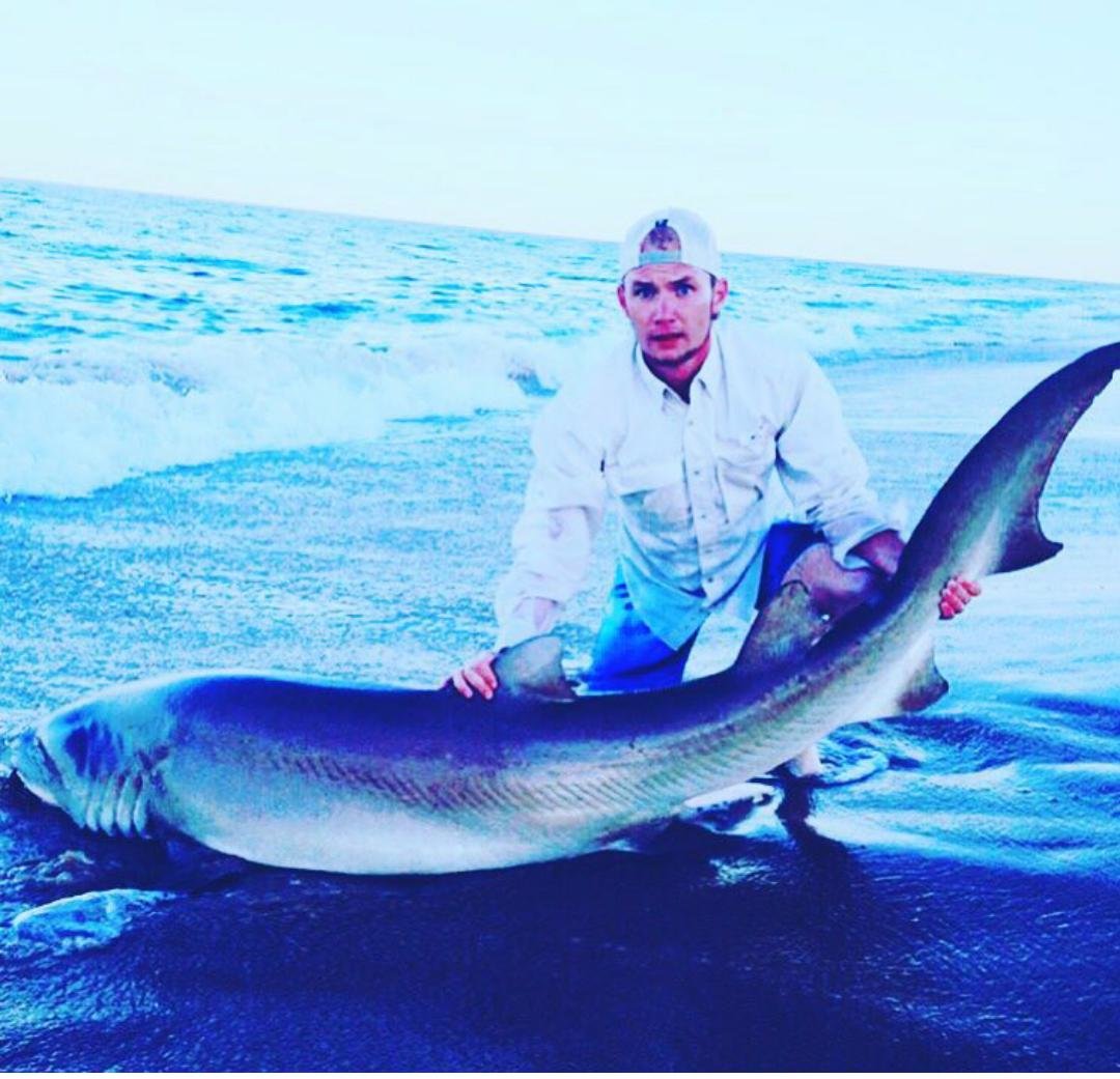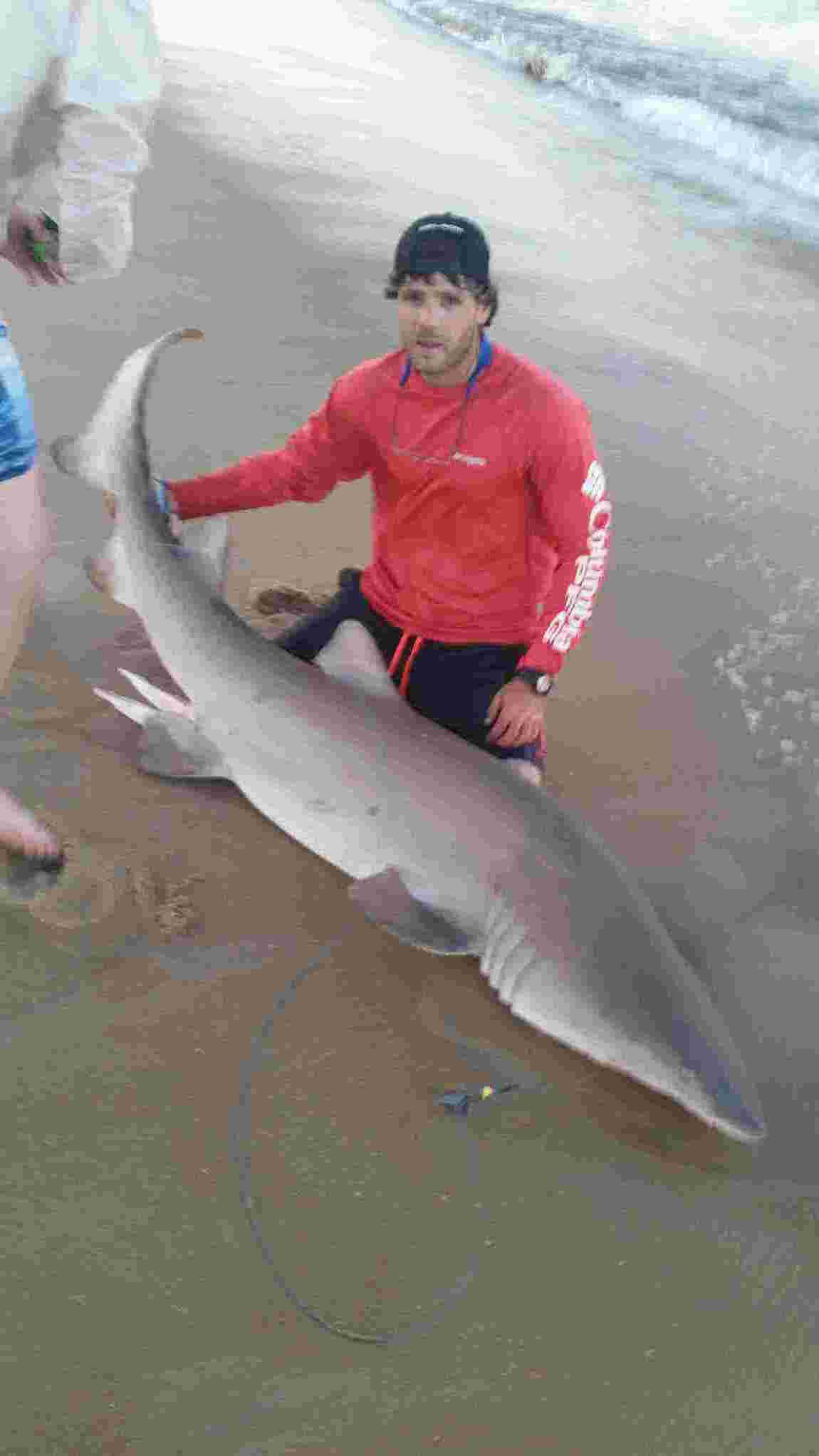 Bear got me some great pics from The OC Sharkin Team of Joseph Porcella and Philip Abrams who buy their fresh bunker at the Oceanic Pier and have been having great luck with sharks in the surf. The OC Sharkin Team has caught a few sand tiger sharks from the beach recently that have ranged in size from 7.5′ to 8′ in length and weighed over 150 pounds.