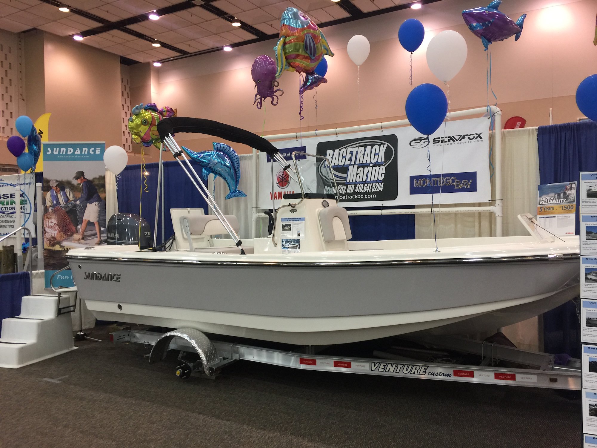 Racetrack Marine is around the corner in booth #435. Racetrack is offering $20 off a purchase of $200 or more or 15% off parts and accessories (excluding electronics). Racetrack has one of the cool Sundance skiffs that they offer on display for you to take a look at and walk around if you’d like.