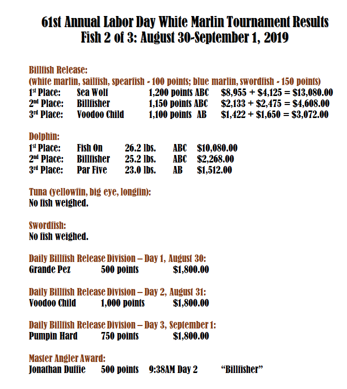 We had another nice weather day today with lots of sunshine and warm temperatures.  The wind did puff a little bit making conditions on the bay a little choppy, but not so much that there weren’t a ton of boats out on it.  Today was the final day of the Ocean City Marlin Club Labor Day White Marlin Tournament and Amanda Shick just got me the results.  Congratulations to all of the winners of this year’s event!