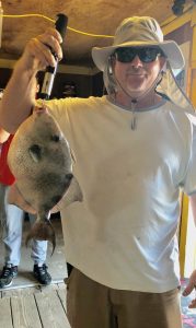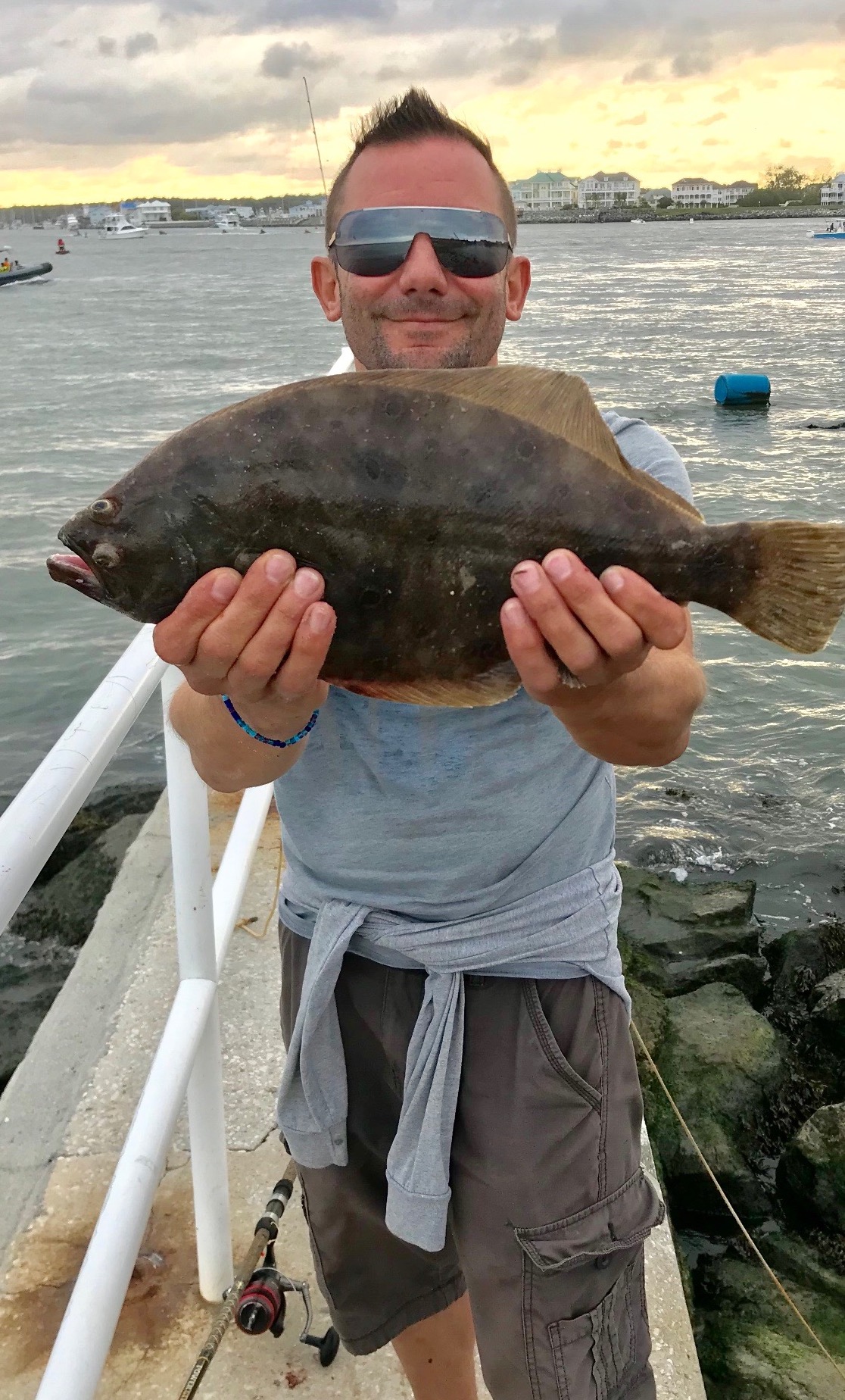 I won’t say that anyone is setting the world on fire, and I haven’t seen any big ones yet, but it’s nice to be reporting that some anglers are catching some grey trout (weakfish) this summer.  Usually we see more fish in the fall as the water temps cool so hopefully seeing some during the summer months is a good sign of things to come.  Bear down at the Oceanic Pier sent in a couple of photos of some nice fish today.  Anatoli had some good luck on the north jetty catching a nice keeper flounder and a good sized aforementioned weakfish.  Bear also had an angler catch a nice triggerfish at the pier today.