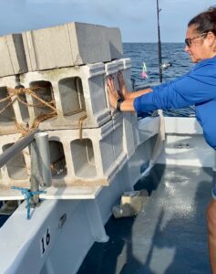 After Kim from NY dropped twenty blocks we motored on off to some good reef bottom I know. There I found some of the loudest crickets you ever heard. “Marking cbass twenty feet thick now – in they go!”