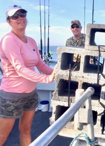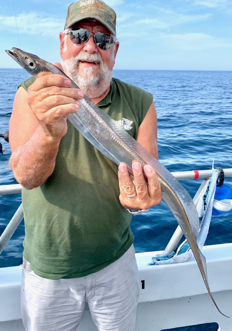 It remains this season’s been the best sea bassing since 2002. Fishing began today soon after Ms Chris pushed reef block #31,036 over. Had an interesting mixed bag right out of the gate when Zig caught a Ribbonfish, then James & Helmut from Georgia boated a giant lookdown – Georgia boys also limited on sea bass. Dan Parsons of Salisbury took our sea bass pool.