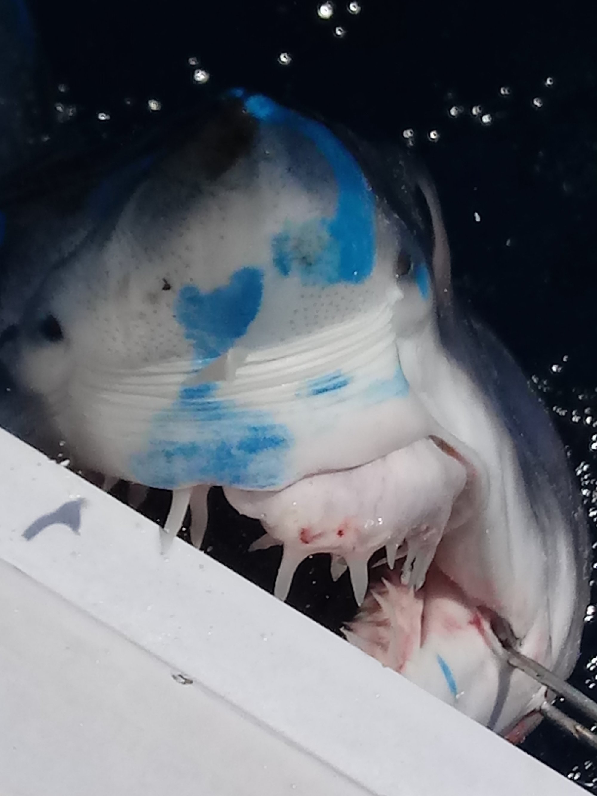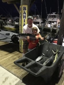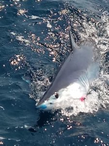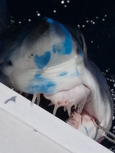 Captain Scott Stapleford of the All In had a productive trip yesterday returning to the dock at 9 PM after some shark fishing. Captain Scott put his crew on a couple of yellowfin tuna, mahi and they also released a 68″ mako shark…..not before he put a little blue skuff on his own nose.