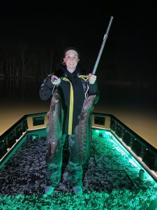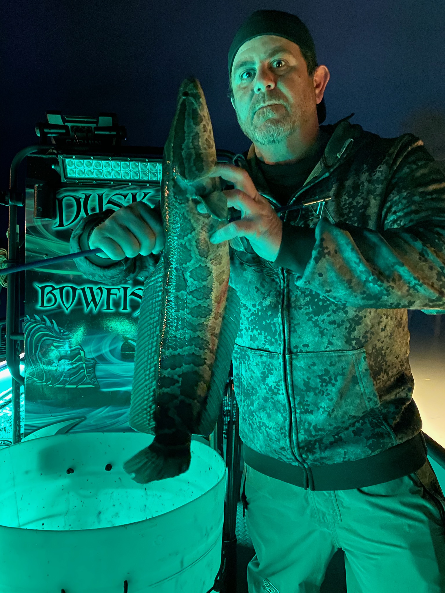 Last night as I was typing out the Daily Angle I was getting texts from Captain Marc Spagnola of Dusk to Dawn Bowfishing that said, “you’re missing it”….”big ones!” A trip that I could have been on was producing well for Captain Marc, his daughter Alivia and Craig Constantino as they were laying the smackdown on some big snakeheads. Captain Marc and the crew had terrific luck bowfishing snakeheads in the shallows and had some reel nice fish end up in the cooler with the largest weighing in at over 8 pounds.