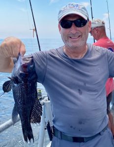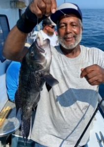 Ron bagged the day’s first fluke limit. Bernie was not far behind – maybe it just took longer to wind in the 6+ pound pool winner? Bernie was also high man on sea bass with 9..