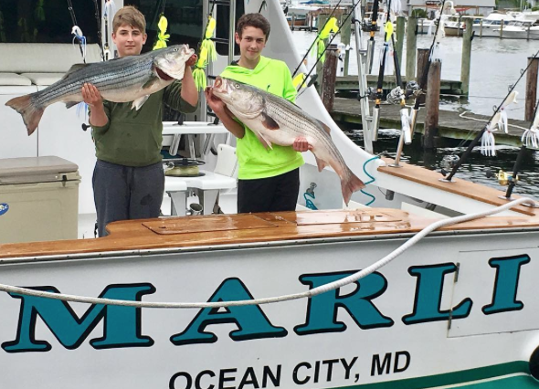 Trophy rockfish season is in full swing over on the Chesapeake Bay and Captain Mark Hoos and mate Mark Stephens of the charter boat Marli have been on the fish really good the past few days. These two young rockfish slayers from Lusby, MD caught two beautiful fish with the largest being a 45″+ slob.