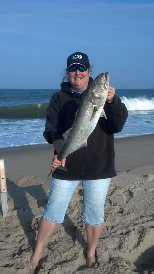Anita Chandler caught this nice 29 1/2″ blue from the surf in Fenwick on a #3 floater hook baited with cut mullet.