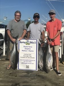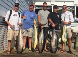Captain Joe Drosey on the charter boat Rhonda’s Osprey was able to find some good tuna fishing today despite the busy offshore waters. Captain Joe put his crew on six nice yellowfin tuna for the box.