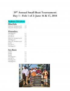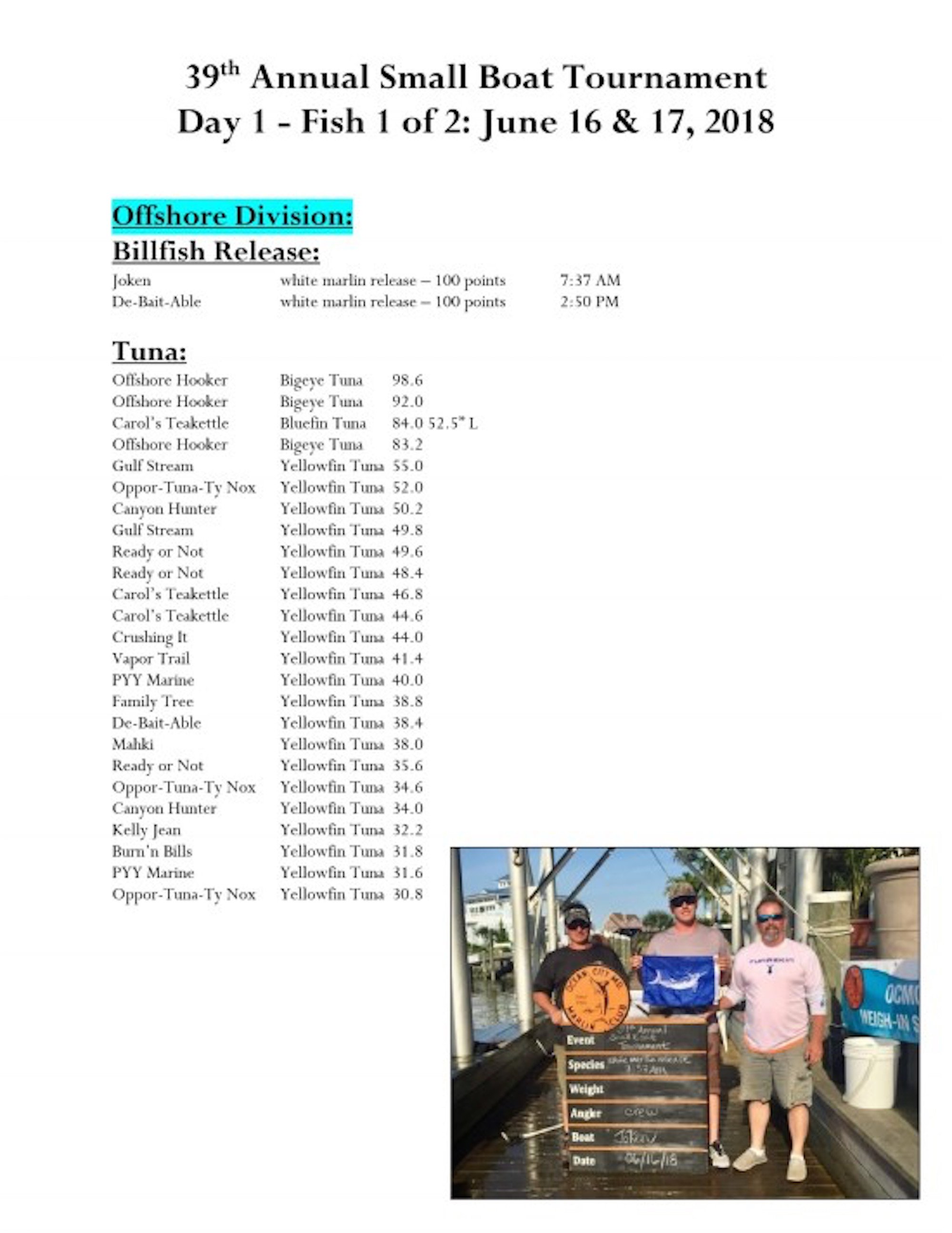 Today was day 1 of the 39th Annual Ocean City Marlin Club Small Boat Tournament and there were a bunch of fish weighed. 38 of the 46 boats total fished today…..here are the standings after the first day of fishing. Click the photos to enlarge.
