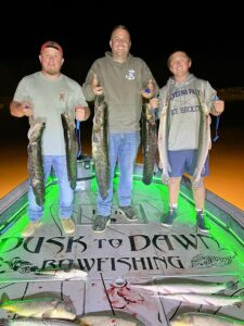 Captain Marc Spagnola of Dusk to Dawn Bowfishing is on the water full time again and the rays and snakes don’t stand a chance. Captain Marc put his clients on some great shooting during the day with a load of rays and again at night with a pile of tasty snakeheads.