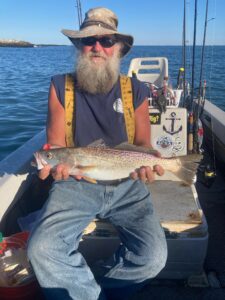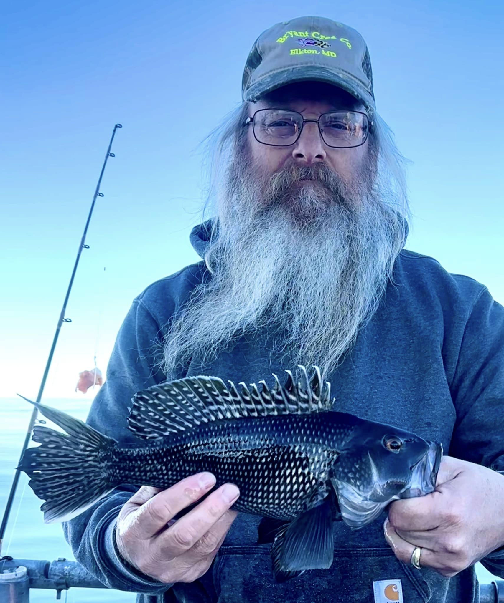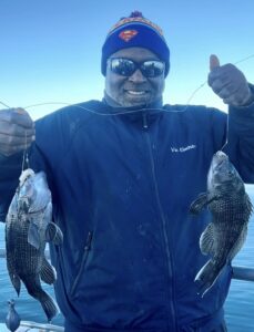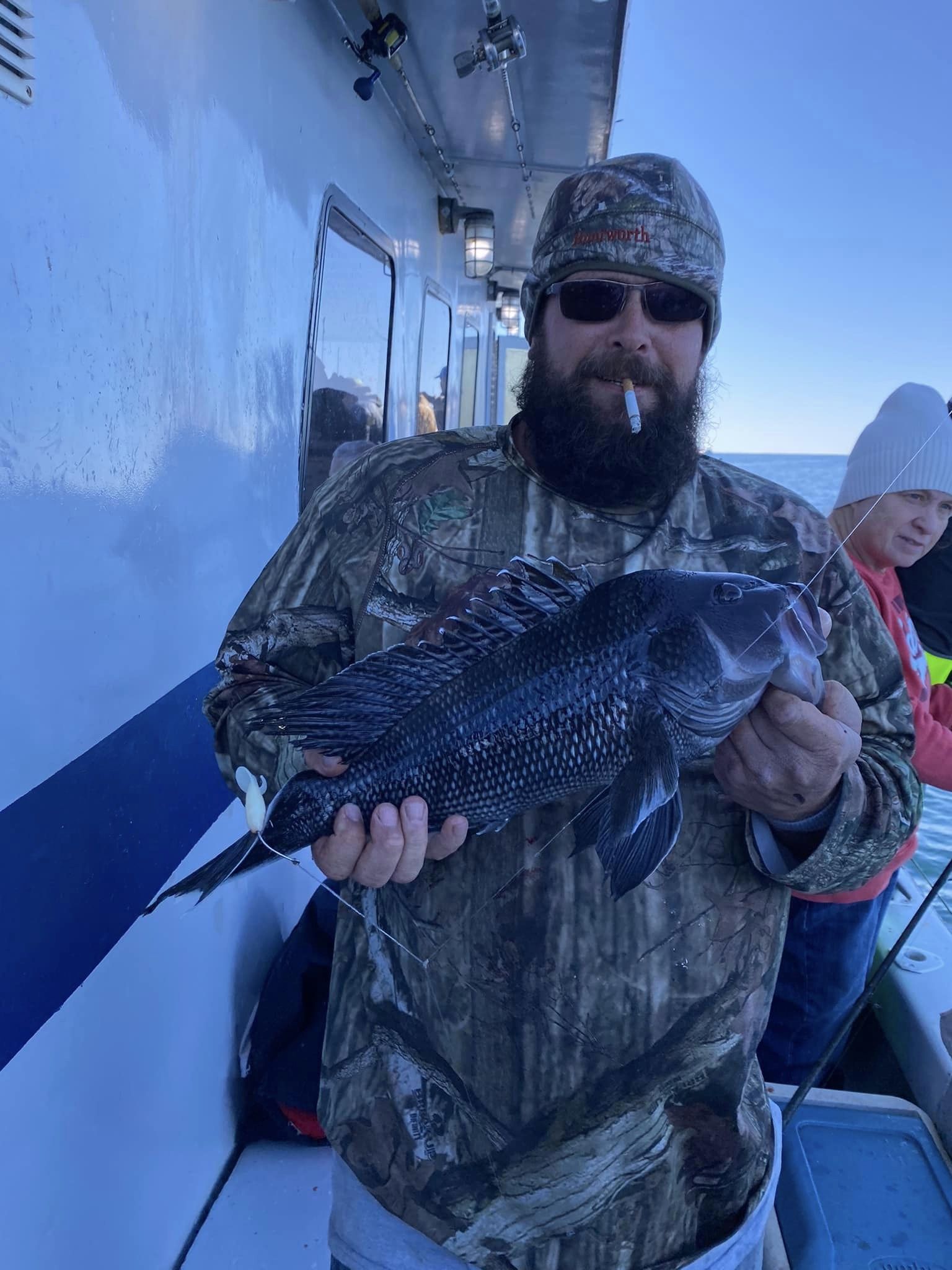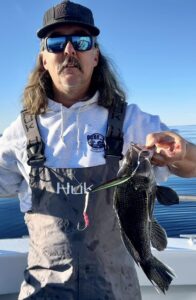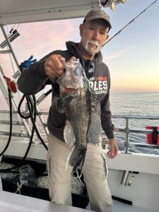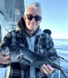 A boat limit of sea bass today despite a lot of weeding through shorts for keepers. Chris was first to bag out in the stern, then Gary. Murray, meanwhile, just didn’t ‘seem’ to be getting the job done. Cathy to his left and Gary to his right, both bagged out, honestly, long before Hurricane did.