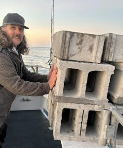 Clearing the inlet we found only a long period swell; its gentle roll somewhat hidden beneath a glassy calm & windless sea. A favorable welcome; I held course for Uncle Murphy’s Memorial Reef where Adam of Fisher’s caramel popcorn fame sent 20 loose blocks over the stern rail and into the landing craft’s well some 60 feet below. A good drop; I’m confident they’ll contribute handsomely to its rugosity – confident these many blocks we’ve dropped and will continue to drop will allow the flat steel where a battle tank would have been brought ashore to quickly erupt with life – especially mussels now and corals in time. This particular reef has a wealth of ‘tunnels’ beneath her deck and into it’s engine room.. Though all our reef species will thrive there, I’especially looking forward to the tog that will set up home there. Very toggy..