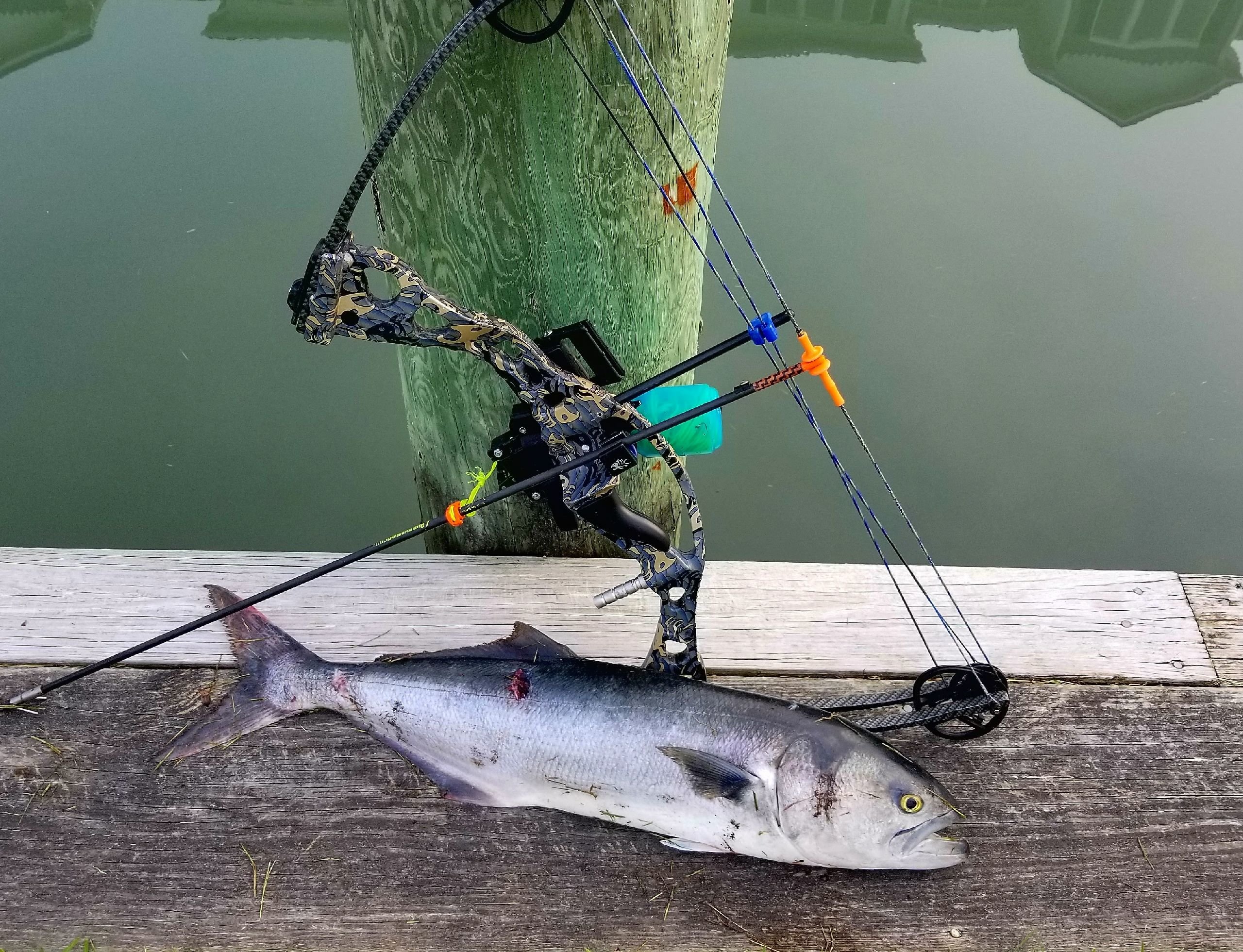 Catching bluefish is awesome, but bow fishing bluefish is more awesome! Captain Marc Spagnola of Fish in OC inshore charter Dusk to Dawn Bowfishing is good at bow fishing skates, rays and snakehead fish, but bow fishing bluefish is next level type stuff. Captain Marc shot this bluefish near the route 50 bridge.