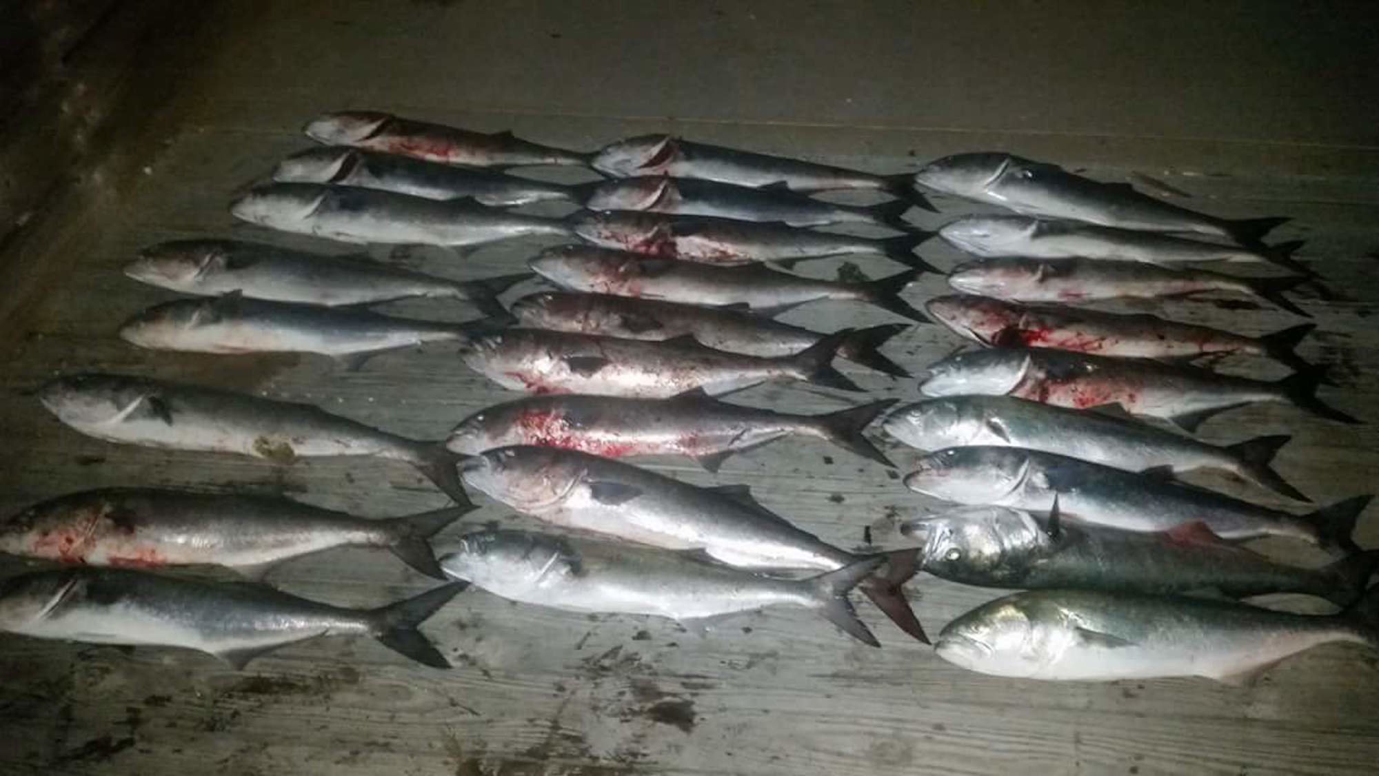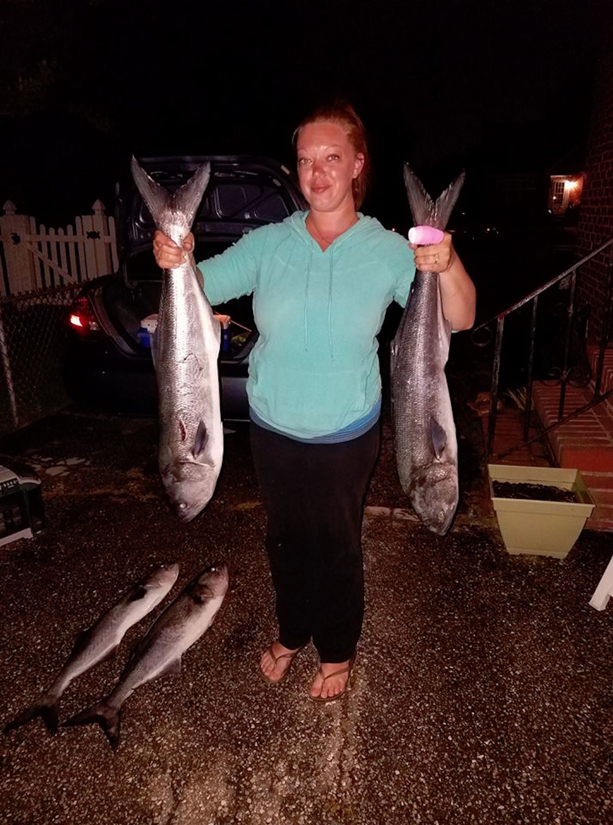 Jennifer Giron sent in a couple of photos of some 35″+ blues that she and her husband caught off of the Oceanic Pier. One of them took a piece of Jennifer’s finger before it went in the cooler.