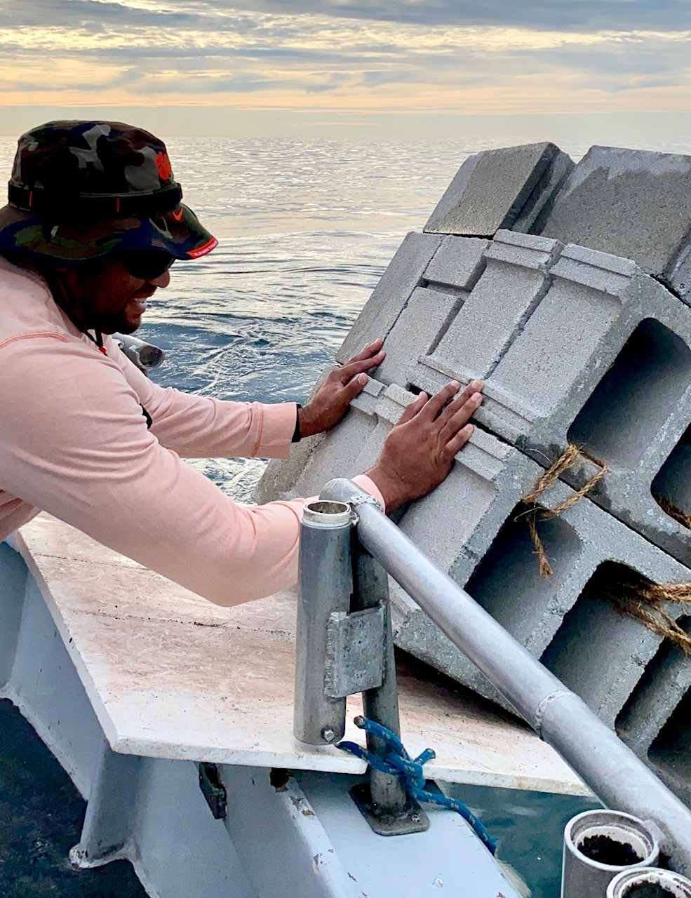 Here two Vietnam era armored personnel carriers from the Army’s Operation Reef Ex in 1994 are about 70 feet apart. We stitched them into a single reef using blocks and block units.