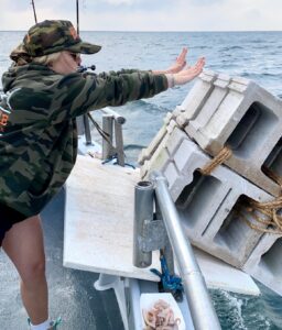 Currently being targeted oceanside: at the Rambler Reef 300 Reef Blocks & 11 Pyramids – Tyler Long’s Memorial Reef 698 (+18 Reef Pyramids & a 115 ft barge!) Virginia Lee Hawkins Memorial Reef 406 Reef Blocks (+72 Reef Pyramids) – Capt. Jack Kaeufer’s/Lucas Alexander’s Reefs 1,988 Blocks (+46 Reef Pyramids) – Doug Ake’s Reef 4,174 blocks (+16 Reef Pyramids) – St. Ann’s 2,909 (+14 Reef Pyramids) – Sue’s Block Drop 1,662 (+24 Reef Pyramids) – TwoTanks Reef 1,323 (+ 15 Reef Pyramids) – Capt. Bob’s Inshore Block Drop 912 – Benelli Reef 1,552 (+ 118 Pyramids) – Capt. Bob’s Bass Grounds Reef 4,171 (+ 90 reef pyramids) – Wolf & Daughters Reef 734 – Al Berger’s Reef 1,598 (+33 Reef Pyramids) – Great Eastern Block Drop 1,528 (+25 Reef Pyramids) – Two more brand New Drops Begun at Cristina’s Blast 120 Reef Blocks & 2 Pyramids & an Unnamed Site South Side GEBD 216 Reef Blocks & 2 Pyramids – Capt Greg Hall’s Memorial Reef 242 Blocks & 2 Pyramids — And 345 Castle & Terracotta Tog Blocks, 10 Pyramids, & 16 pieces pipe 81 feet Bass Grounds Unnamed.