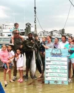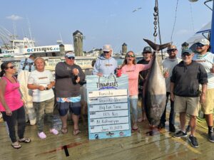 The crew of the Fish in OC charter partner Pumpin’ Hard with Captain Mike Burt and crew fired 191 pounds of tuna onto the dock at the Ocean City Fishing Center and took first place in both the Heaviest Stringer category and the daily stringer category.