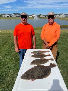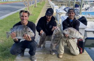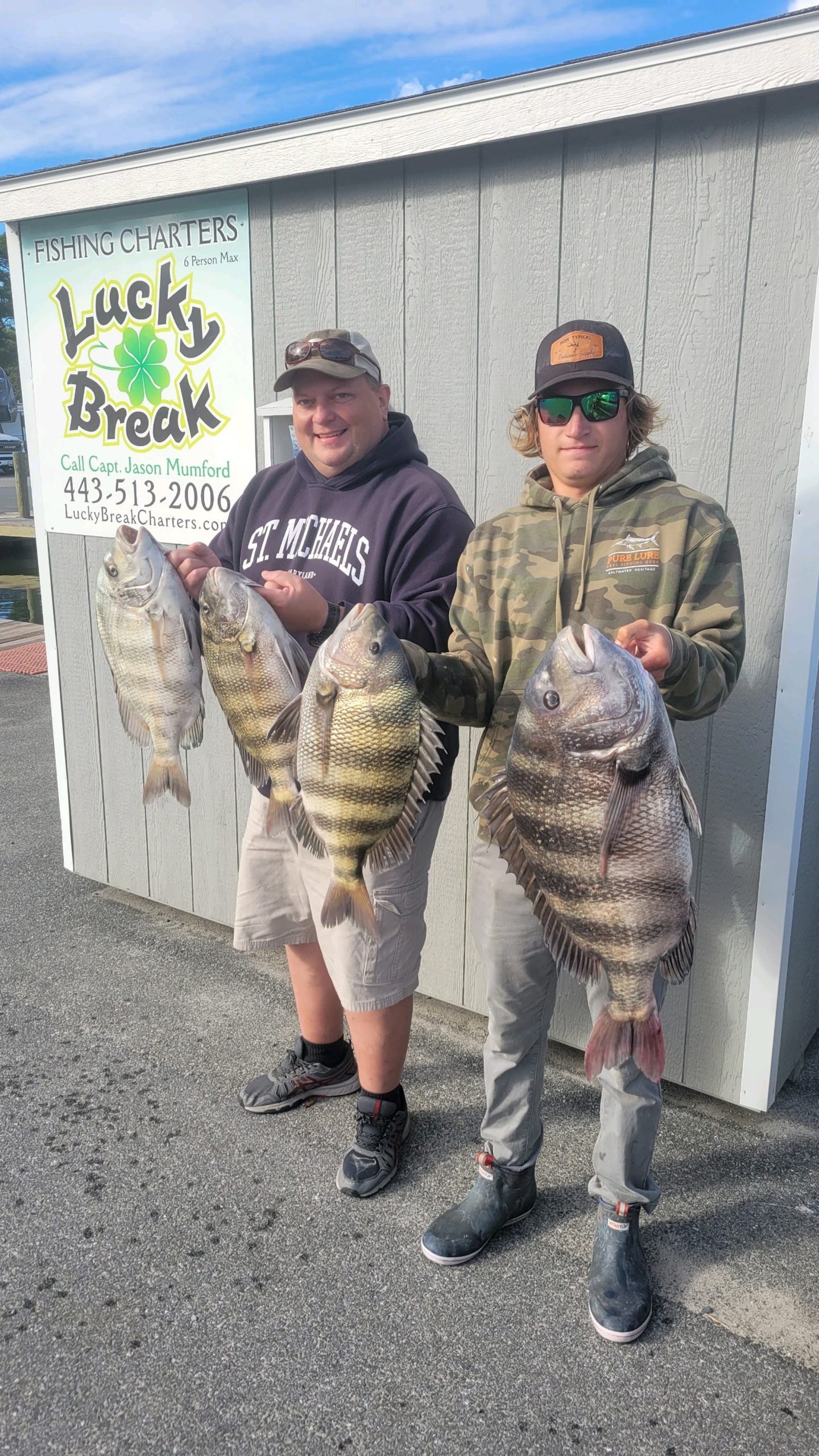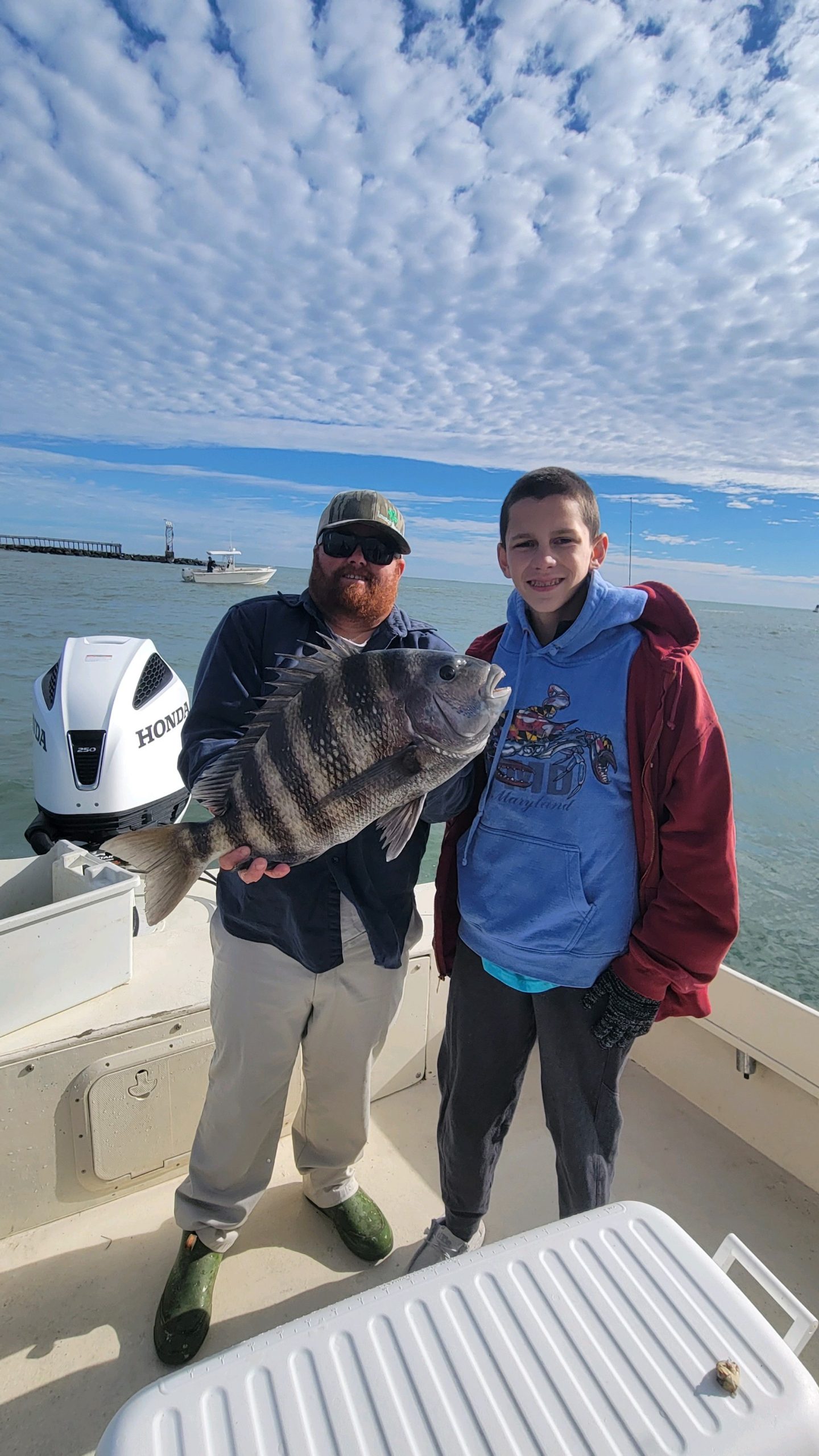Captain Jason Mumford of Lucky Break Charters had the frontrunner for Feature Image tonight when he sent me a photo of 10-year-old Ethan Collier from Mount Joy, PA with a very nice 10.5 pound sheepshead, but a little while later that fish was beat by another Ethan. Captain Jason’s mate Ethan Nock from Berlin, MD stole Feature Image rights away this afternoon when he caught a real big 13.7 pound sheepshead! Captain Jason’s afternoon trip had four nice sheep with the smallest at over 8 pounds. Ethan is pictured with Norm Thurston from Pasadena, MD.