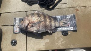 Another big sheepshead fell at the hands of Austin Deppe who was fishing the south jetty with sand fleas when he hooked into this jumbo 25″, 12.3 pounder. Austin was fishing with the boys and had another sheepshead, a black drum and a tautog.