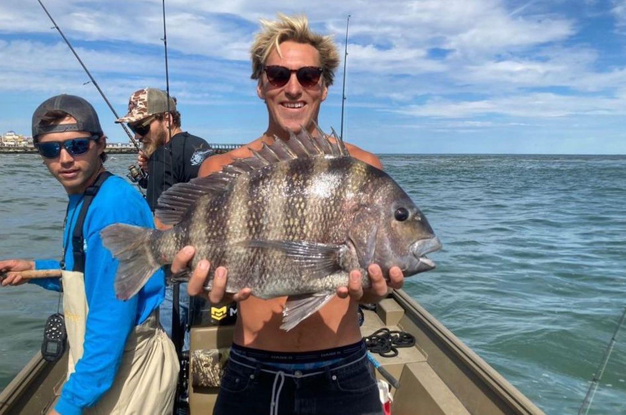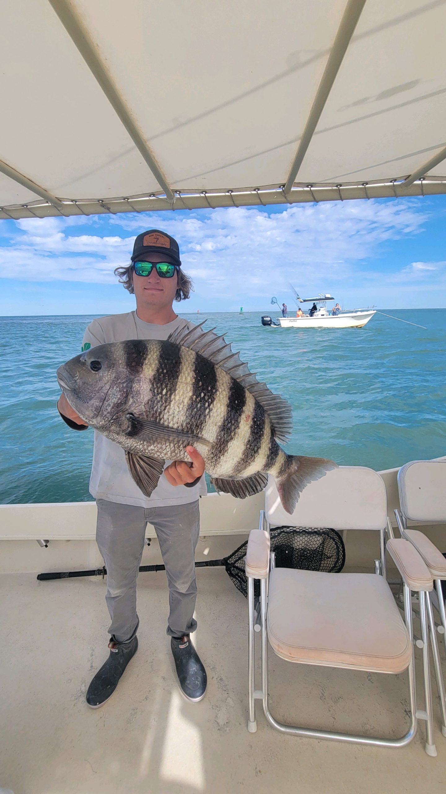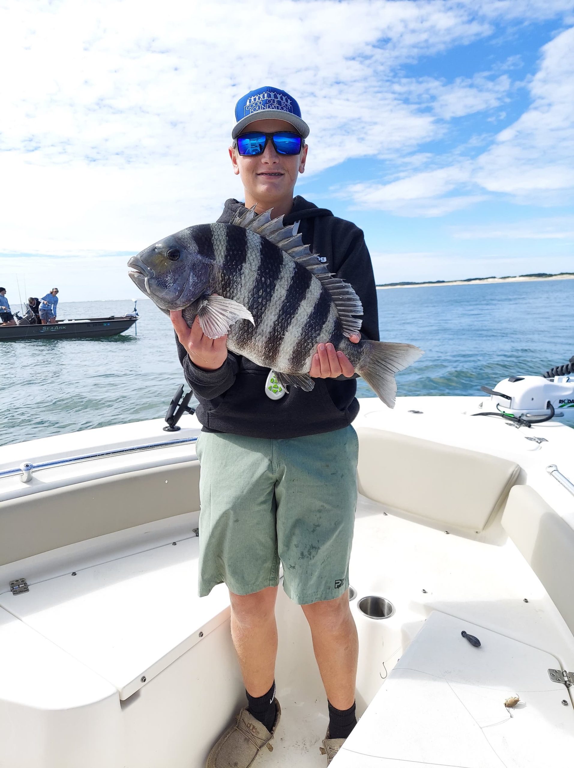 Yet another big sheepshead was caught at the south jetty today when Stone Carey landed this very nice 21″, 7.2 pound sheep. Sand fleas were once again the meal of choice.