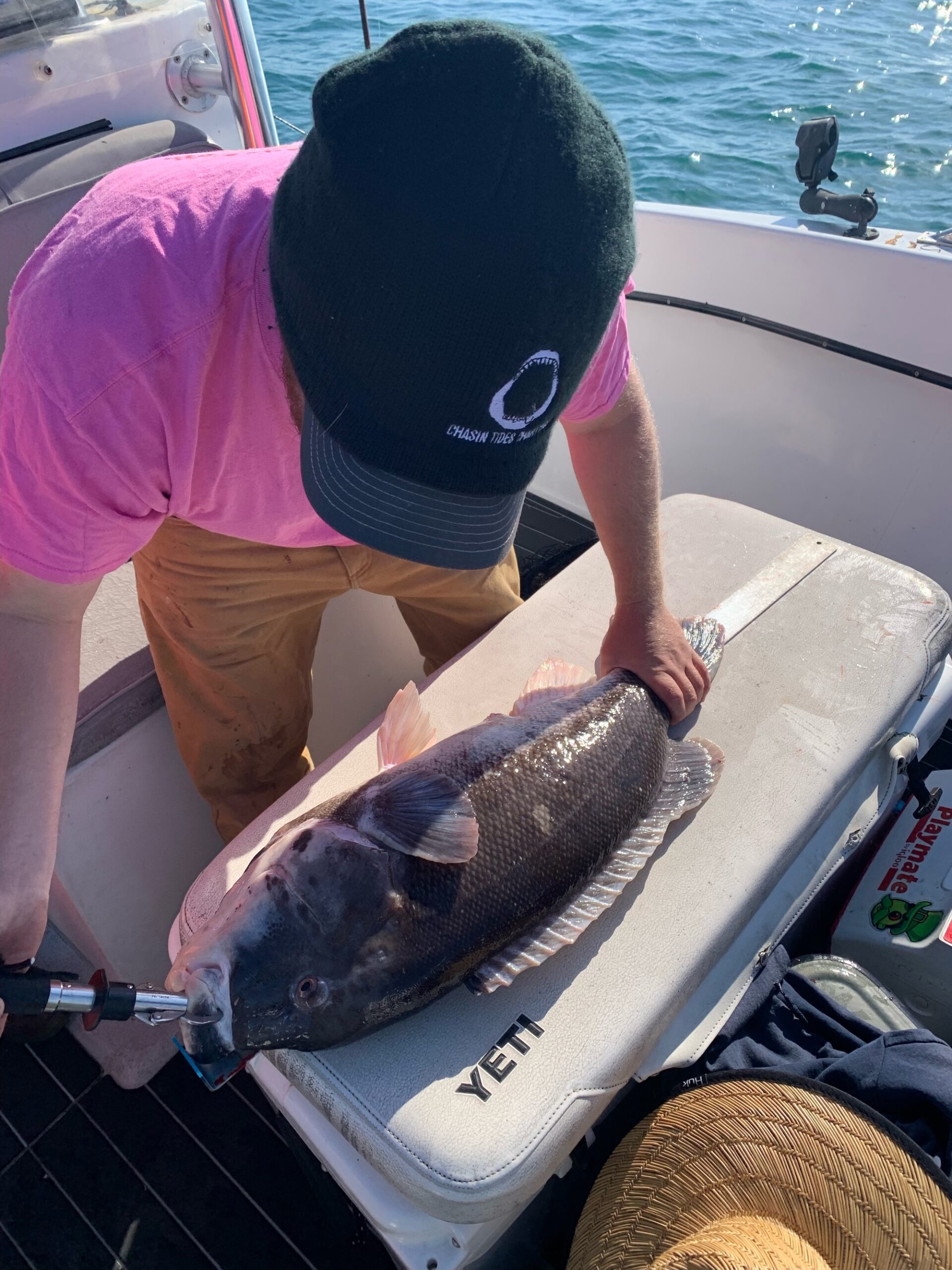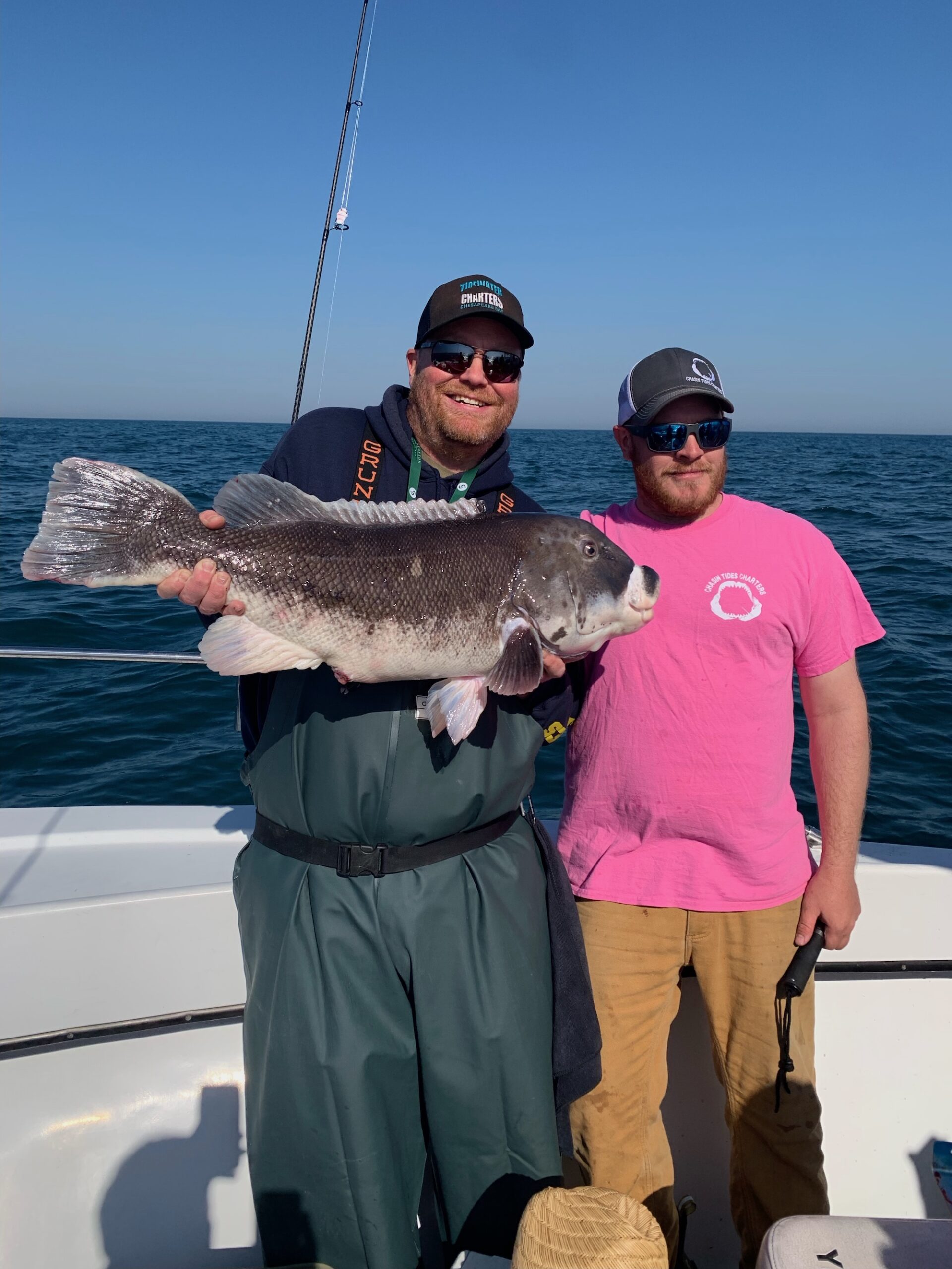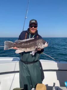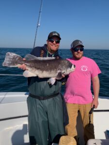 Capitan Chase Eberle of Chasin’ Tides is having a great season with the double digit tautog and today he set a new record for his boat. Captain Chase put an angler on the largest tog ever on Chasin’ Tides today when a huge 23 pounder went in the net. The big male was weighed, measured to 33″ and then released to make more tog. Pretty work!