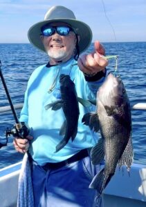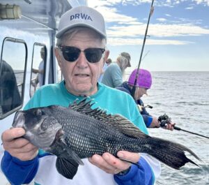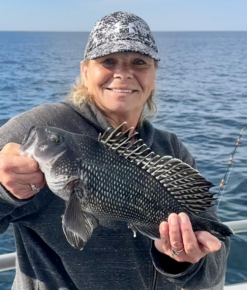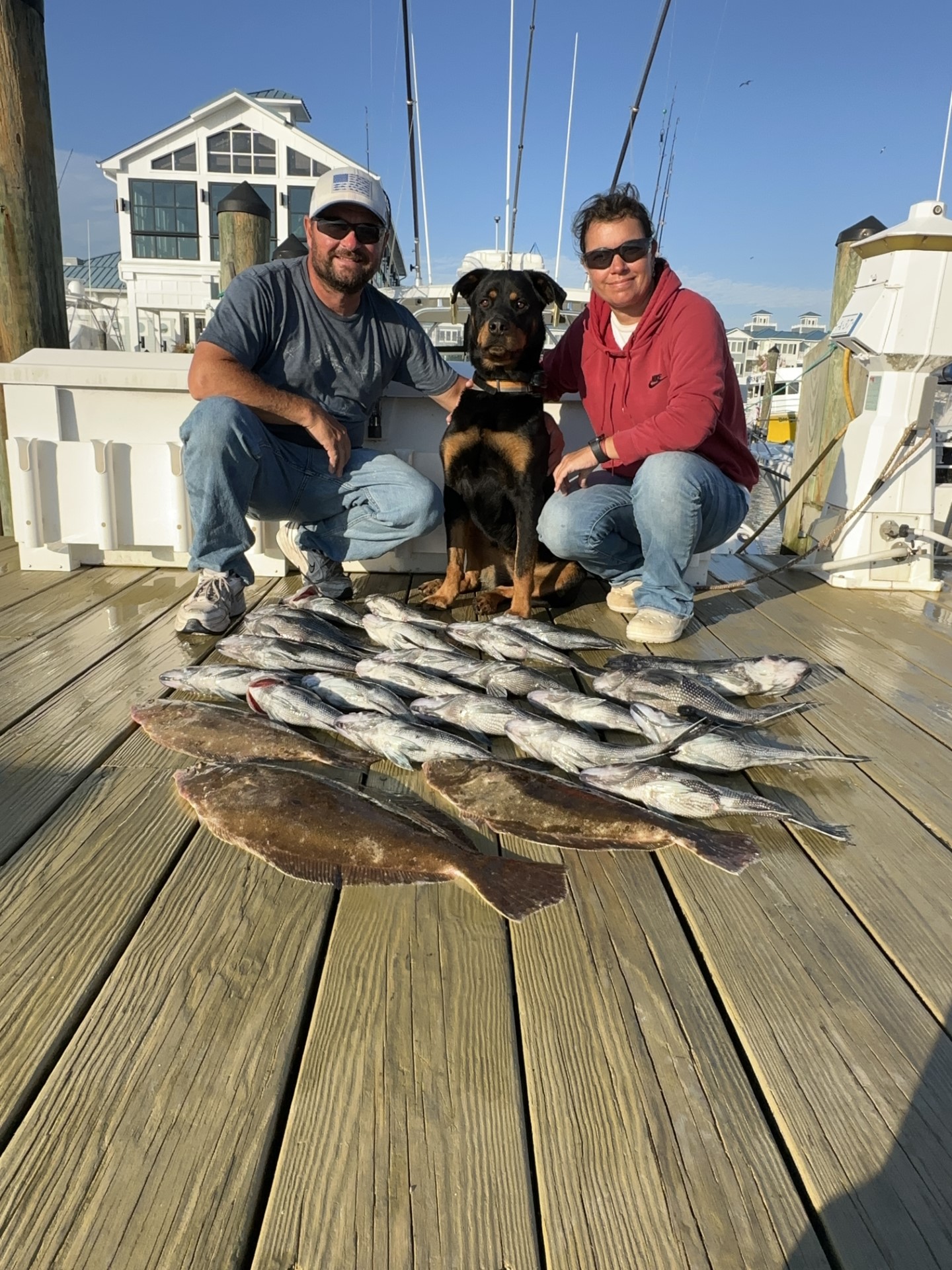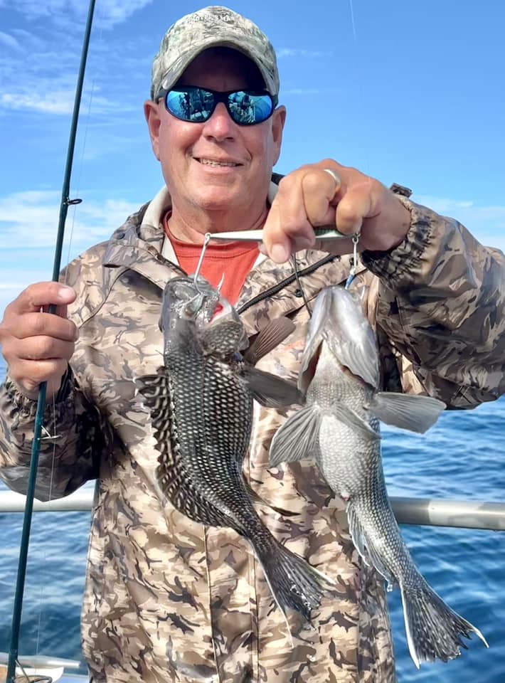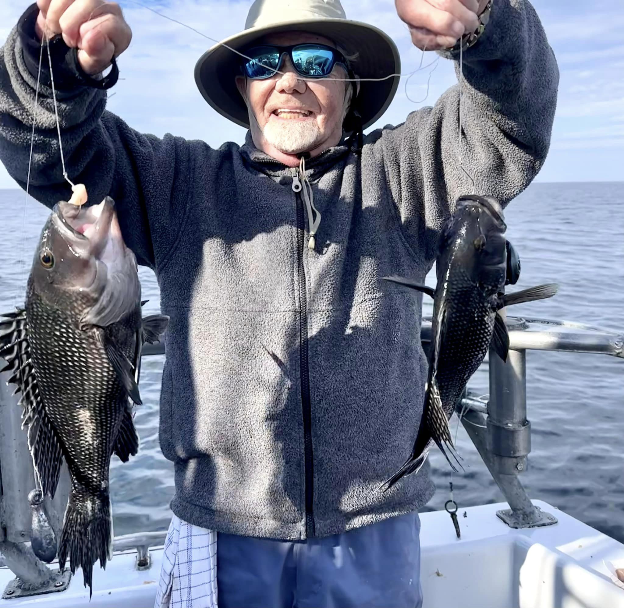 JD and Mary Eddy, and Biscuit had a good day of fishing on their final trip of the season boxing up three flounder and 22 sea bass.