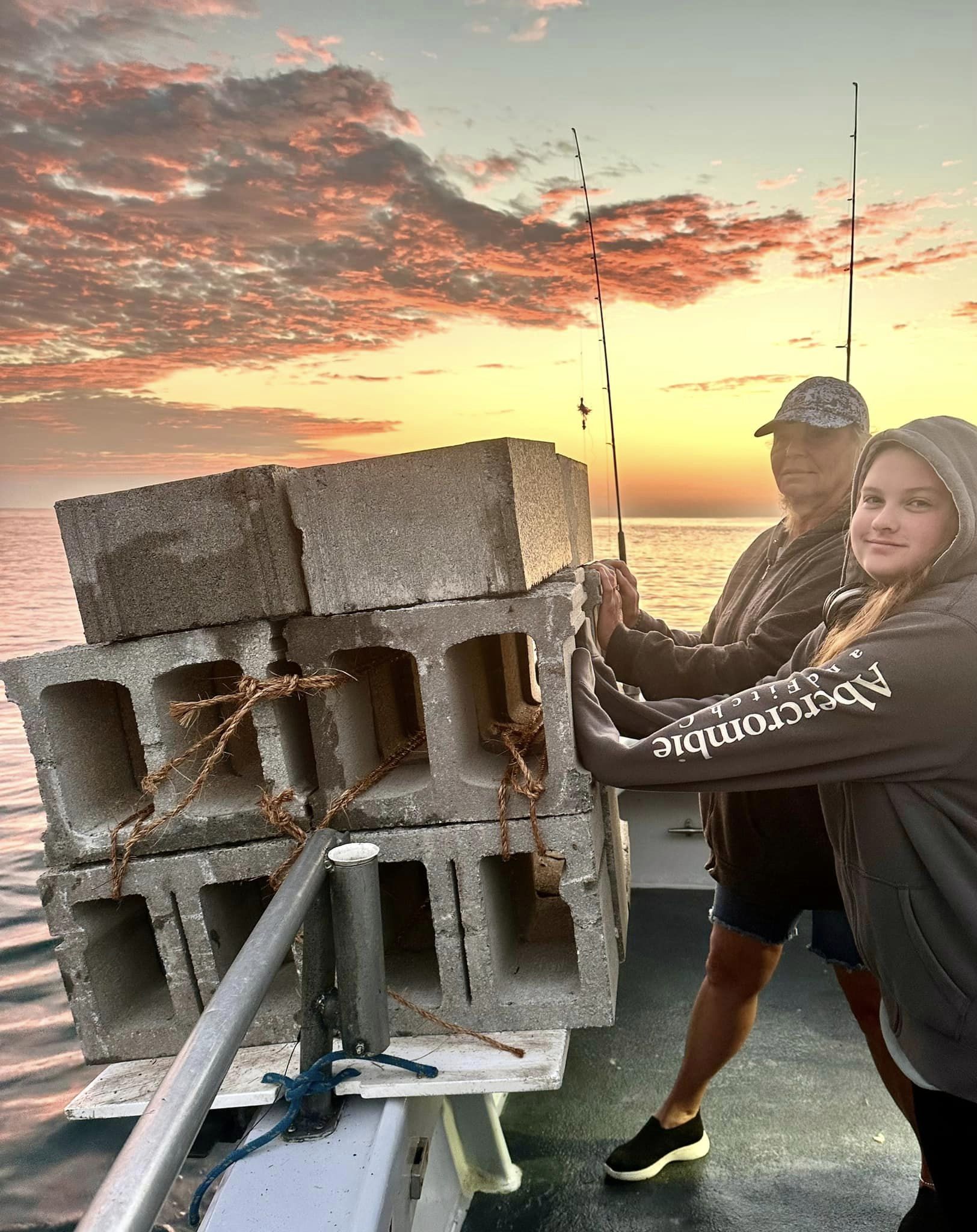 Ms Sherry & young Ms Alyssa dropped twenty reef blocks into that gorgeous sunrise amidst 544 pyramids now deployed at Bear Concrete Reef. There will be many more.. Sure made for an epic picture. This reef isn’t on ‘the list’ for block drops. Reason I was there was to sidescan Capt Stormy’s latest (& quite impressive!) deployment. Monitoring component accomplished and blocks deployed, we pressed on.