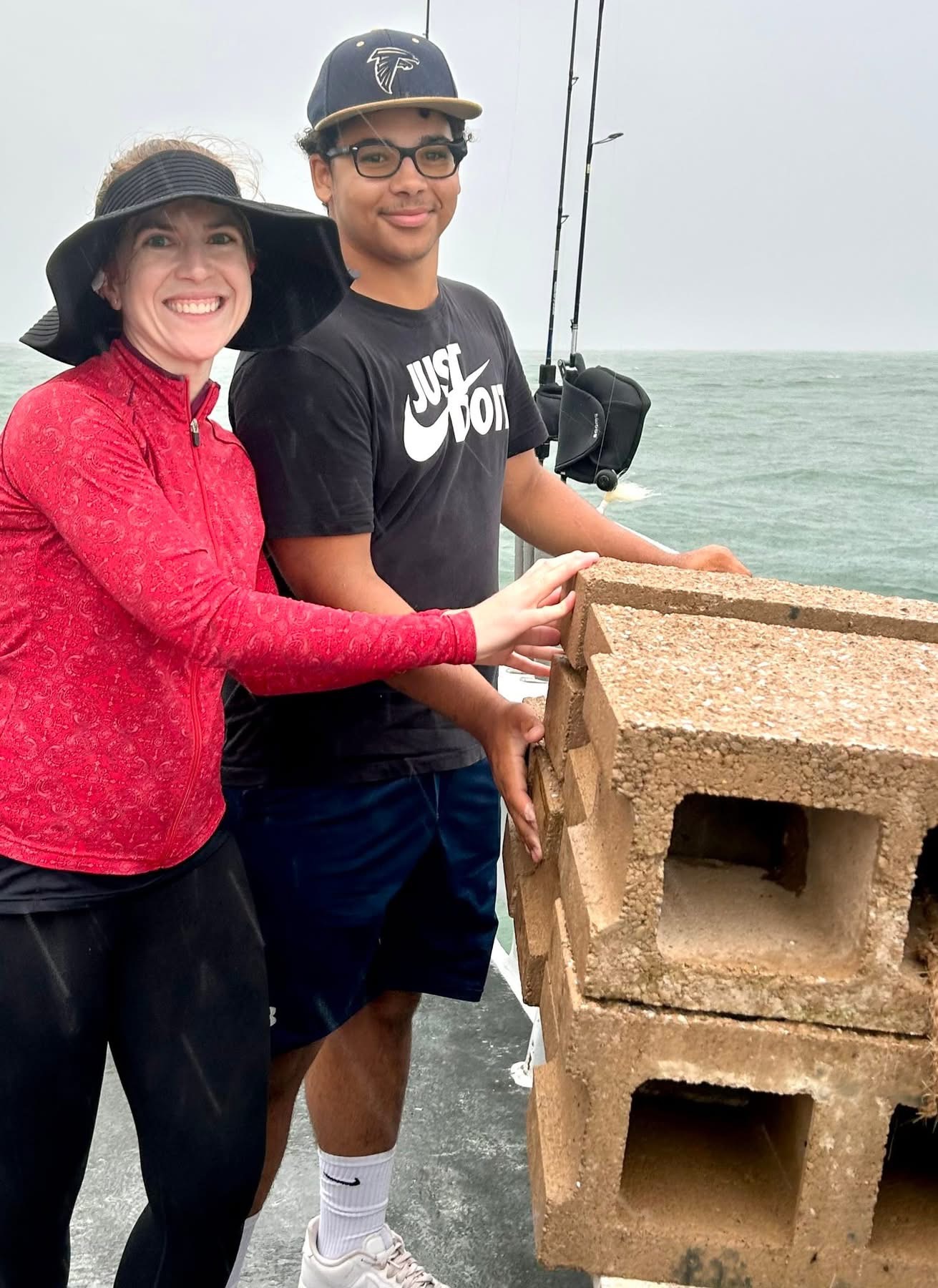 Dark gray skies with intermittent drizzle and rain made for a less than splendid departure this morning. We ambled on off to our newly sunken barge at Ringmaster’s Reef Group where Mom/Sarah and Jonah deployed a small block unit on the barge’s concrete deck – the first of what will become many..
