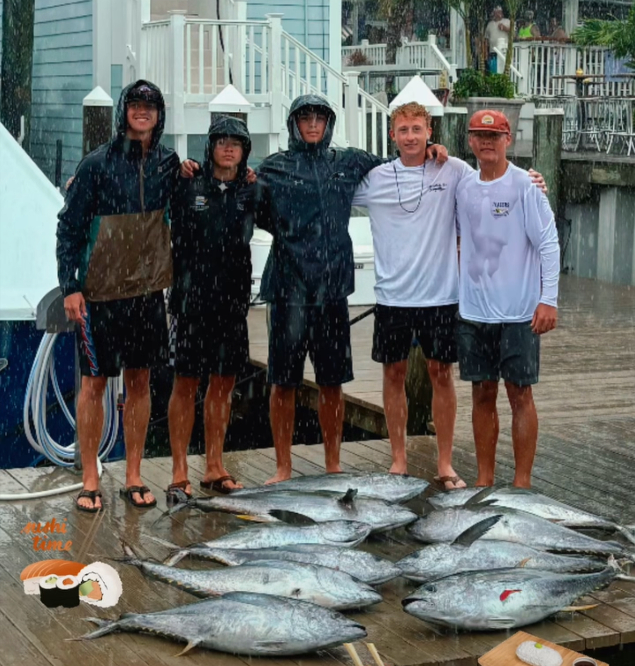 the crew of the Boss Hogg with Captain Brian Porter had a great day with a pile of yellowfin tuna and then took a picture in the pouring rain at Sunset Marina.