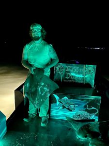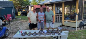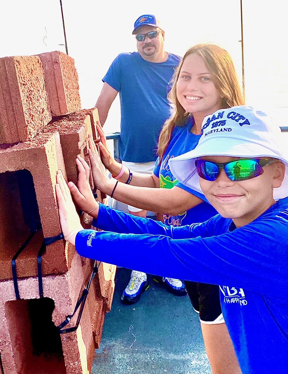 Young Mr. Gabe Arick from Wilmington DE & Hadley H from Pittsburgh PA shoved this morning’s reef unit over. Twenty heavy blocks stitched together makes a fine unit. Day after day they build a decent reef. Won’t be long and Capt Bob’s Memorial Reef will have over 4,000 blocks.