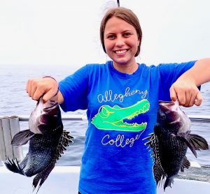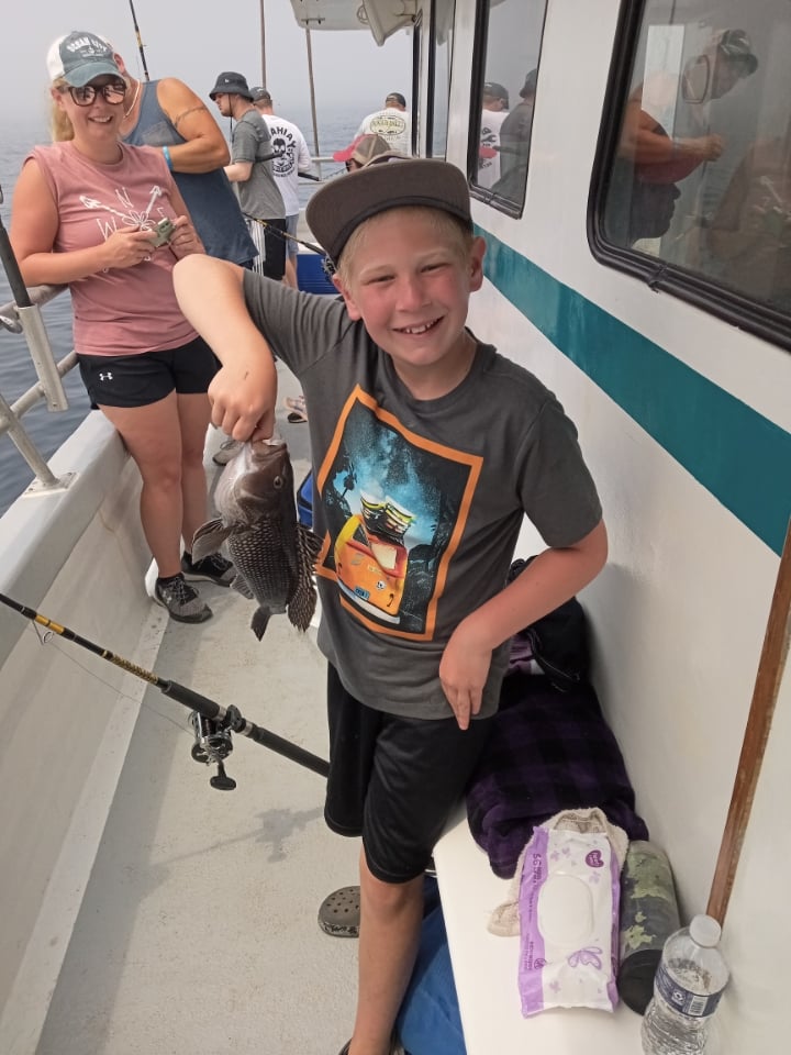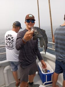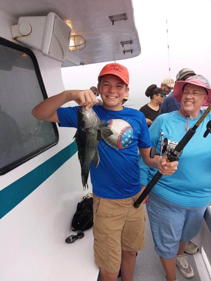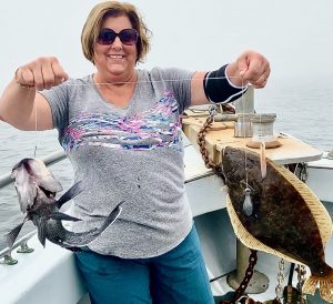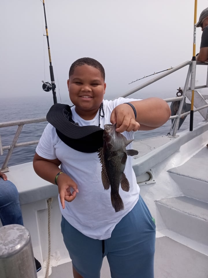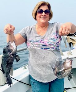 Sea bass didn’t mind the fog. Kim S of Mt. Wolf PA was first to bag out. there were only two others. She had the hot hand for sure. Caught the day’s only keeper fluke too..