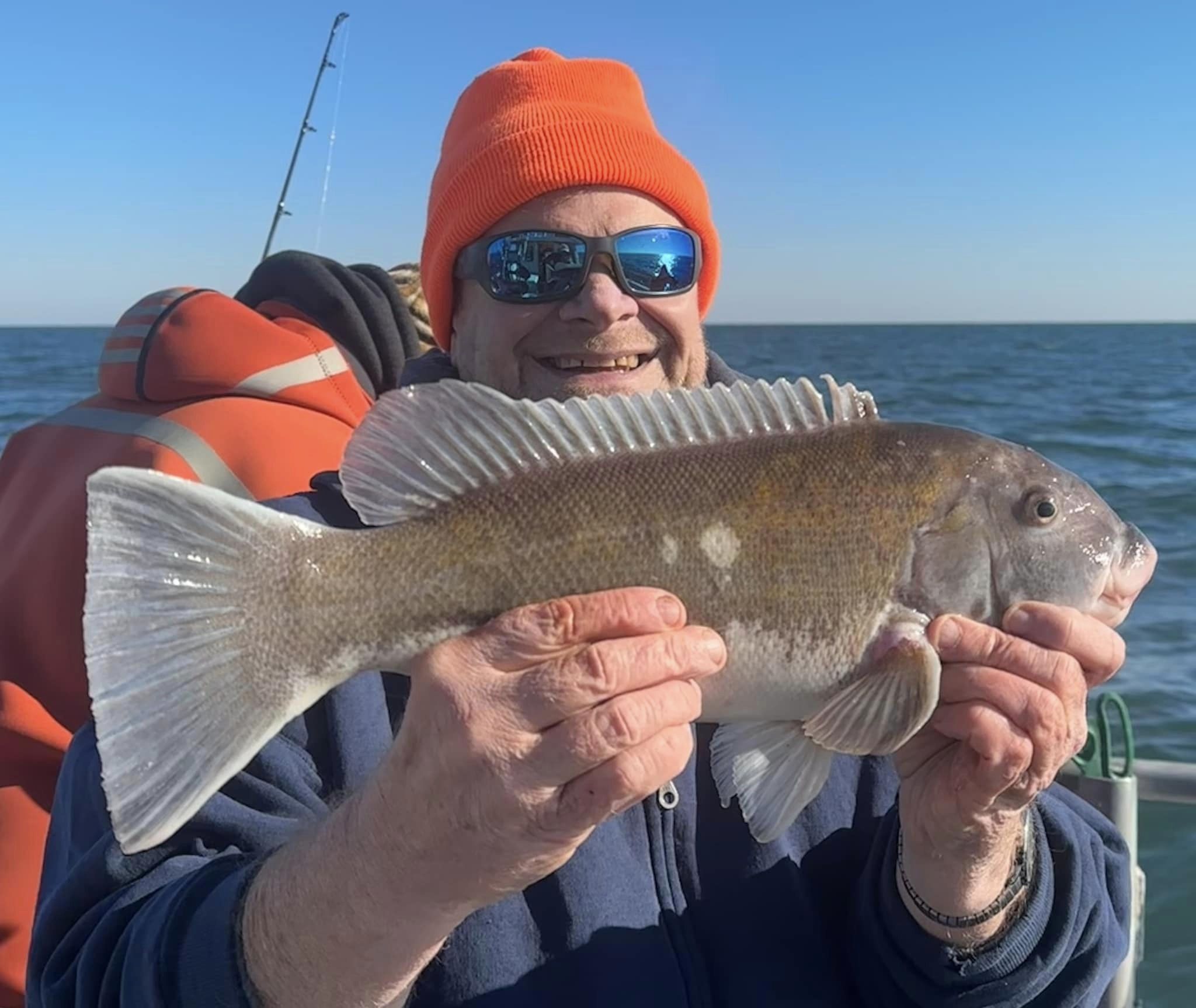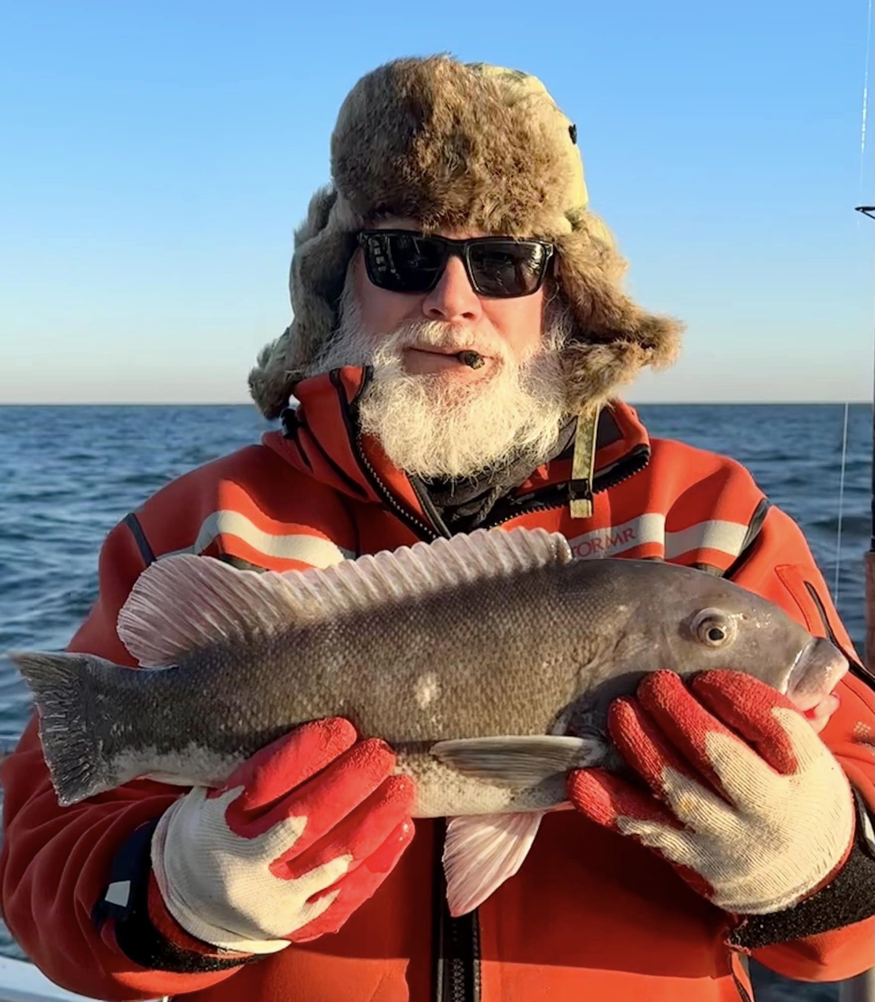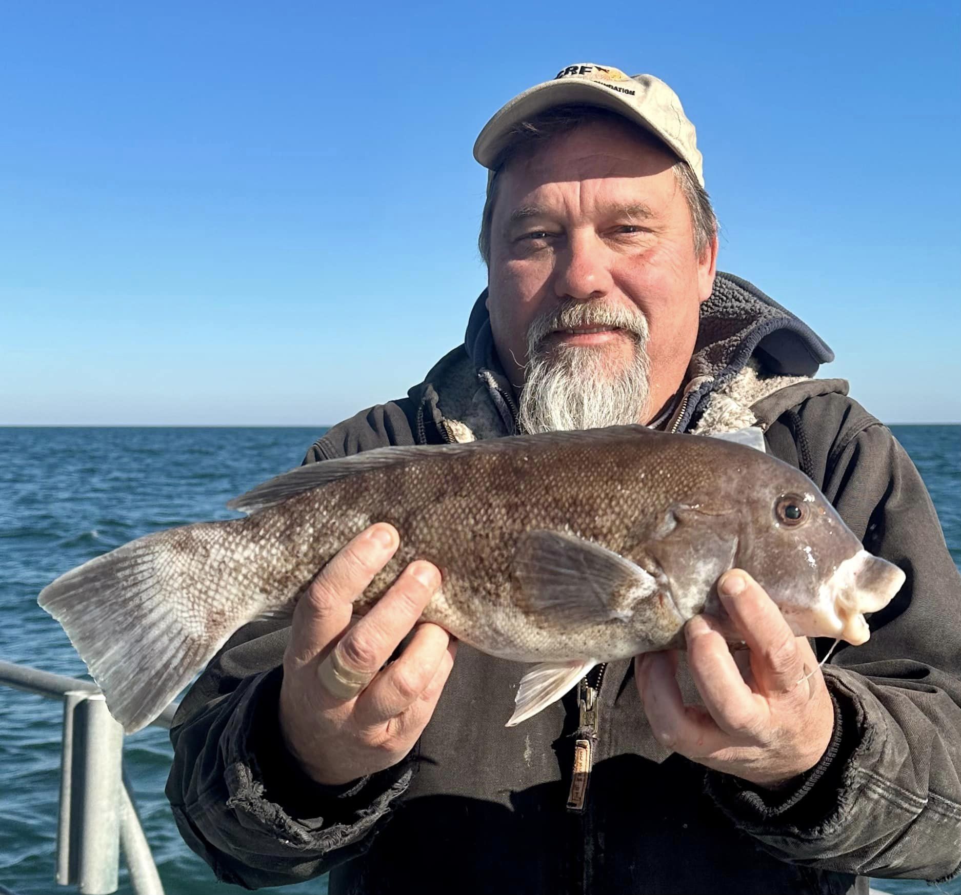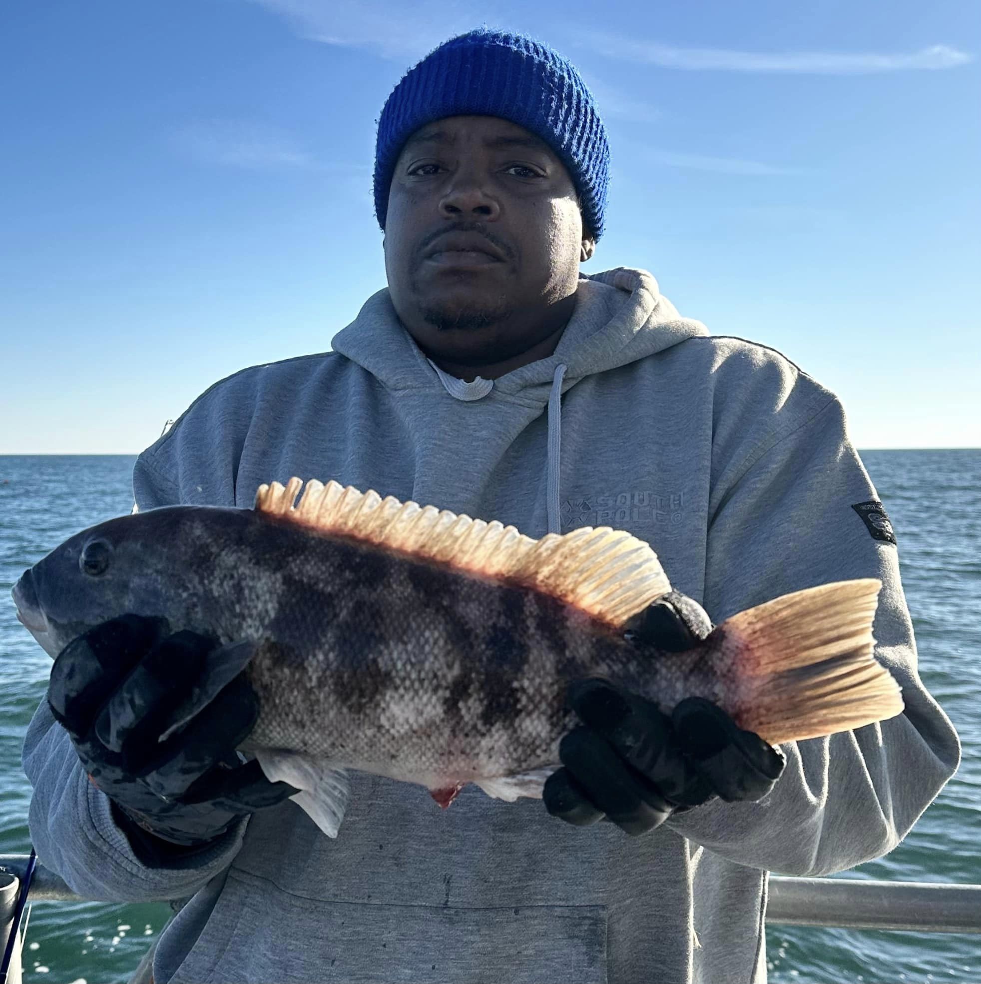 Light rail toggin 12/14/23 Stayed tight to the beach today. Was in no mood to deal with 18/19 knots of west wind any further off. It’s all about ‘fetch’. The more miles of open water a wind can come across, the worse sea heights will be. Vahe and Renat dropped 20 blocks and some teracotta pipe at Sue’s Block Drop (where Tanner snapped some pics!) – I spun around to anchor. Those fellows didn’t collect on their reef karma, but they sure caught a lot of tog. Fishing sure wasn’t slow. I’ve seen incredibly worse. Mark even took a Morning Star limit of 2 males/1 fem. Put back lots of “Third Fin Rips” including 5 that had previously been marked. See Murray’s fish and one on the measuring board for examples of Third Fin Rip.. No Jumbos. I think we’ll have to have cbass rippin good for a decade or so before that’s the case. I used to catch DD tog in sight of land quite regularly – a lot of em. But when sea bass closures began? Effort blew up on tautog – inshore especially. Same thing happened with flounder inshore. When fluke were closed with absolute garbage data showing 50,000lbs of summer flounder caught from MD’s OC & Assateague Beaches (yeah right!) Fifty Thousand Pounds Caught Surfcasting.. Uh Hu.. Closed in September, suddenly a whole lot of flounder fishermen needed something to do – suddenly the inshore tog stock was sheared at size limit. Guys that had kept it to themselves are still crying about it. NOAA says they’re going to fix MRIP. For now? More pain from bad data. Tomorrow another sea bass trip – then a big blow. First real one in a while. Hope it doesn’t kill the bite!Cheers, Monty