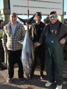 Something that is usually not biting this time of year, but has been biting very well the past few weeks are the bluefin tuna that are just off the beach.  Some really nice fish have been caught and harvested, and we’ve even had some fish larger than the 73″ maximum that have been released.  Today, Travis Smith and brothers Bob and Dave Werner caught this very nice 57″ bluefin that weighed in at 125 pounds.  The fish ate a 6 oz Joe Shute with a ballyhoo behind it just 4 miles off the beach.